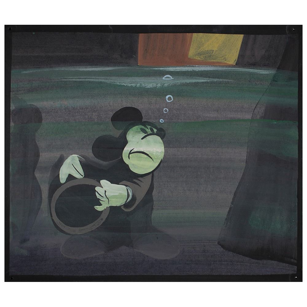 (Walt Disney Studios, 1940) Original concept painting of Mickey Mouse from the 'Sorcerer's Apprentice' segment of Fantasia, which shows the young wizard-to-be standing underwater as he fruitlessly attempts to scoop out water with his bucket after his magical broom plan backfires. Accomplished in gouache on black 7 x 6 artist's board. In fine condition, with tack holes to corners.