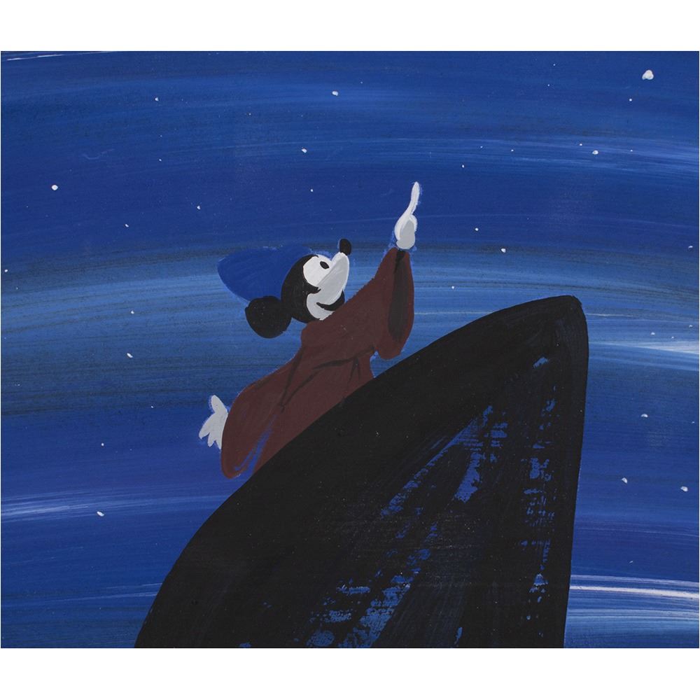 (Walt Disney Studios, 1940) Original concept painting of Mickey Mouse from the 'Sorcerer's Apprentice' segment of Fantasia, which shows the young wizard-to-be in Yen Sid's hat during his magical dream sequence: standing atop a pinnacle as he commands a comet while waves crash below him. Accomplished in gouache on black 9 x 8.5 artist's board. In fine condition, with tack holes to corners. A desirable piece of concept artwork from a classic Disney feature.