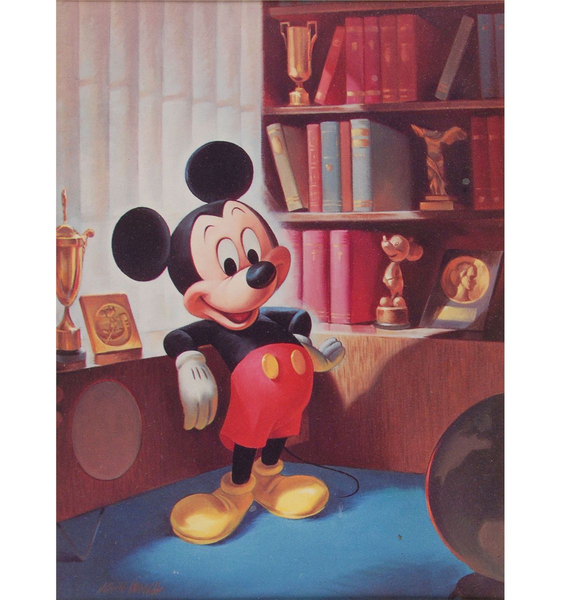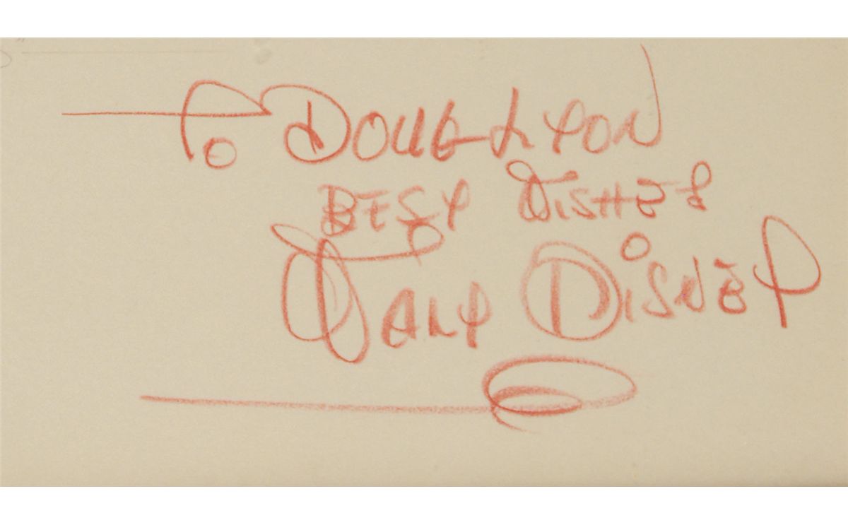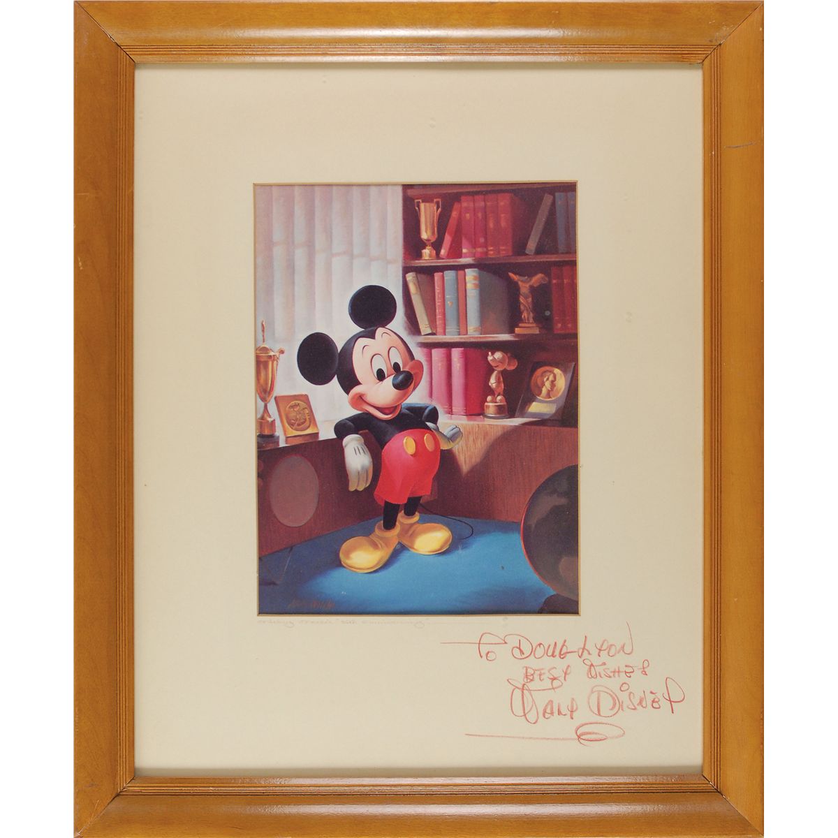(Walt Disney Studios, 1953) Original dye transfer print featuring Mickey Mouse from the ‘Mickey Mouse’s 25th Anniversary’ painting by John Hench. Image measures 7.5 x 10, matted as prepared by the Art Props Department at Disney Studios and framed to an overall size of 16 x 20, with the Disney label affixed to the backing. Boldly signed and inscribed on the mat in red pencil by Walt Disney. In fine condition.