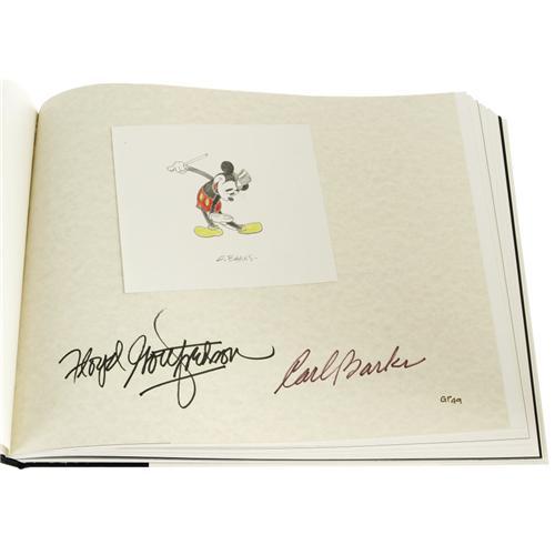 <B>"Mickey Mouse in Color" Deluxe Limited Edition Signed by Barks and Gottfredson (Another Rainbow, 1988).</B></I> The deluxe 60th anniversary "Gold Plate Edition," #49 of a limited edition of 100, signed by both Carl Barks and Floyd Gottfredson on a special parchment autograph page. The 248-page book measures 16" x 12" and features 72 pages of full color Sunday comics by Gottfredson, 72 pages of daily comics by Gottfredson, and rare early Mickey Mouse drawings by Barks - as well as "The Riddle of the Red Hat," the only Mickey Mouse story ever written by Barks, reprinted here for the first time. The book also includes a 6" x 7" hand-colored Mickey Mouse sketch signed by Barks, and a limited edition seven-inch 45rpm Mickey Mouse picture disc record (also #49 of 100 copies), featuring an interview with Barks and Gottfredson, in a special pocket in the rear inside cover. Usually found in the hands of serious collectors, these volumes rarely come up for sale. The book and its contents are in Excellent condition and protected by a special mylar cover. <BR><BR><B>Important notice:</B> Heritage usually auctions material at the rate of 200-250 lots per hour. On some occasions eBay Live bid software or the Internet may not be able to keep up with the pace of the auction. We recommend placing a realistic absentee bid now as insurance to avoid disappointment. Occasionally the auctioneer may eliminate or reject an eBay Live bid, and the auctioneer may also reopen a lot after the close of the eBay live bidding (usually because we missed an audience bid), and may reject your bid even if it shows you as the winning bidder. By bidding via eBay Live, you agree that Heritage may award the lot to another bidder at its sole discretion under the circumstances described above or any other reasonable circumstances. Since eBay bids are not shown to us until we open the lot on the floor, we treat those bids just like floor bids. In most cases the floor responds before the eBay bid is presented to us, due to Internet lag time, so for consistency we have made it a policy that floor bids are always considered first over tie eBay live bids. Also please note that all Heritage lots purchased through eBay Live carry a 22.5% Buyer's Premium. Please make sure you read the Terms and Conditions before you bid. This lot is being auctioned in conjunction with a live floor auction by Heritage Auction Galleries. All final auction and invoice information will be supplied by Heritage Auction Galleries, and all other information should be considered preliminary. Lot:41001 <BR><BR><B>Winning Notification and Billing:</B> After the FINAL session in this auction is complete, Heritage will send e-mail and snail mail invoices. This process normally takes several days. All final auction and invoice information will be supplied by Heritage Auction Galleries, and all other information should be considered preliminary. <BR><BR>This auction will be conducted on a live auction floor and over the Internet through eBay Live. If you choose to place an absentee bid, please take a moment to <font color='#0000ff'><u><a href='http://pages.ebay.com/liveauctions/help/before/laabsentee.html'>learn how eBay Live absentee bidding works</a></u></font><font color='#000000'>