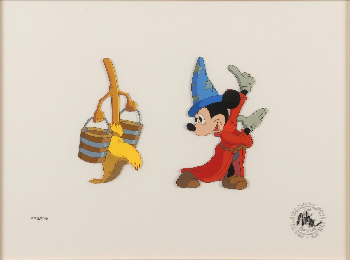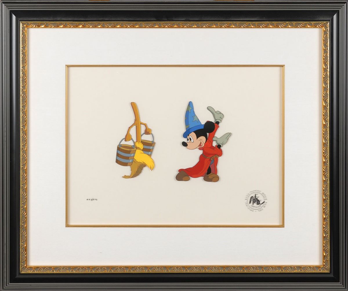 (Walt Disney Studios, circa 1980s) Original limited edition hand-painted cel featuring Mickey Mouse, numbered 223/275, portraying him as the Sorcerer’s Apprentice from Fantasia. Total image measures 8 x 5.5, with a mat opening of 14.5 x 11. Framed to an overall size of 24 x 20, with a Disney certificate of authenticity affixed to the backing. In fine condition.