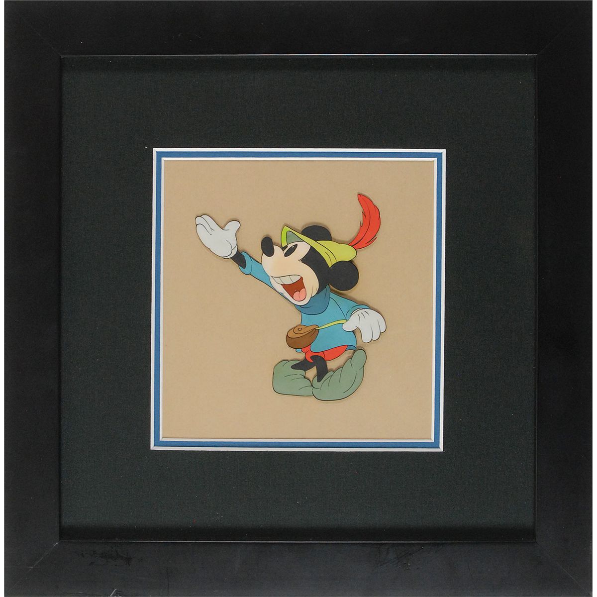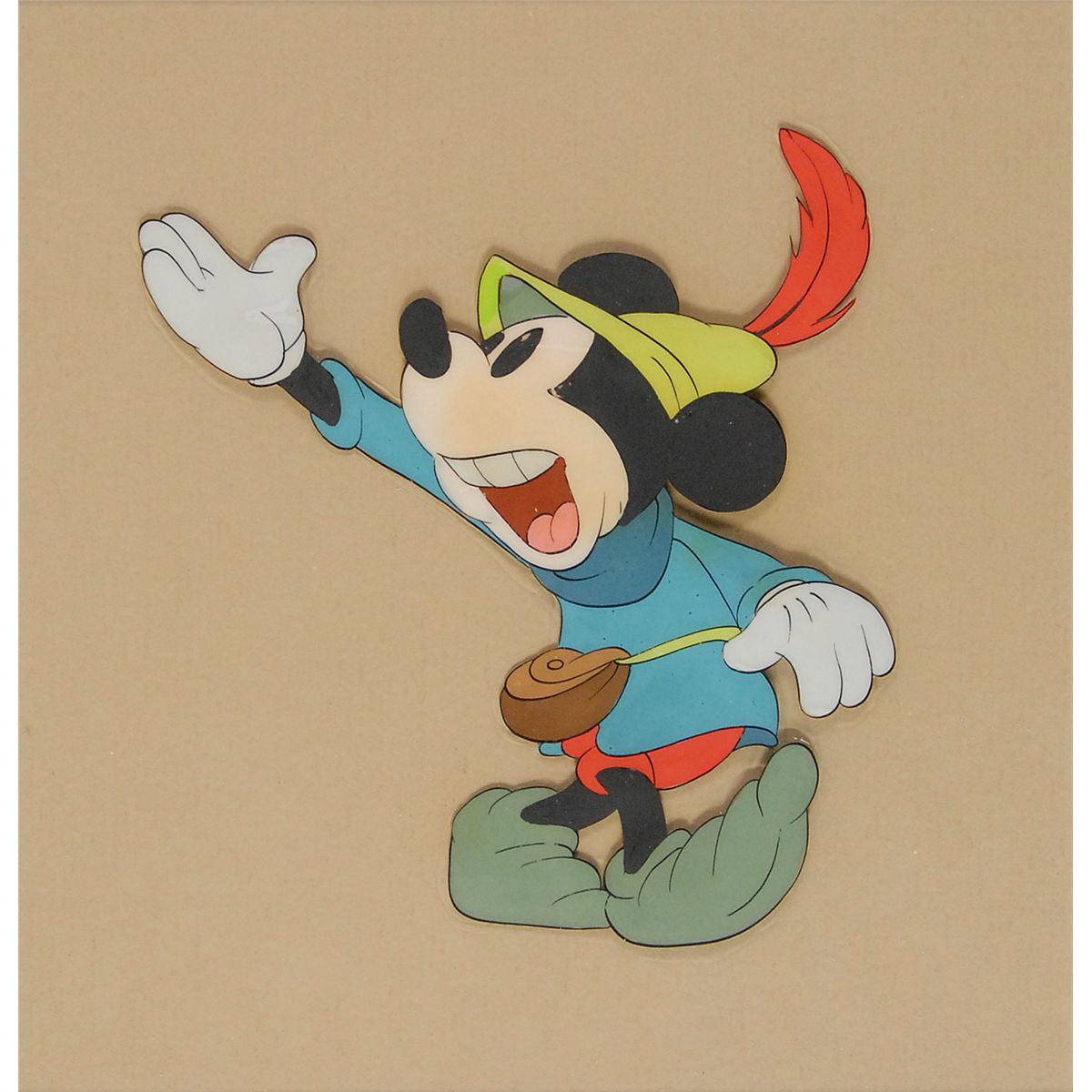 (Walt Disney Studios, 1938) Original production cel featuring Mickey Mouse from Brave Little Tailor, showing him in costume as the title character. The cel is trimmed to image. Image measures 4.5 x 4, with a mat opening of 6 x 6.25. This piece is also framed to an overall size of 13 x 13.5. In fine condition, with some trivial cracking to paint. Accompanied by a Whitney Museum of American Art exhibition tag. This cartoon was an adaptation of the fairy tale The Valiant Little Tailor and cast Mickey Mouse in the title role, voiced by Walt Disney himself. It was nominated for the Academy Award for Best Animated Short Film in 1939, but lost to Disney's own Ferdinand the Bull; it is still considered one of Disney’s greatest shorts, and in 1994 the film was chosen as the 26th greatest cartoon of all time by members of the animation field.