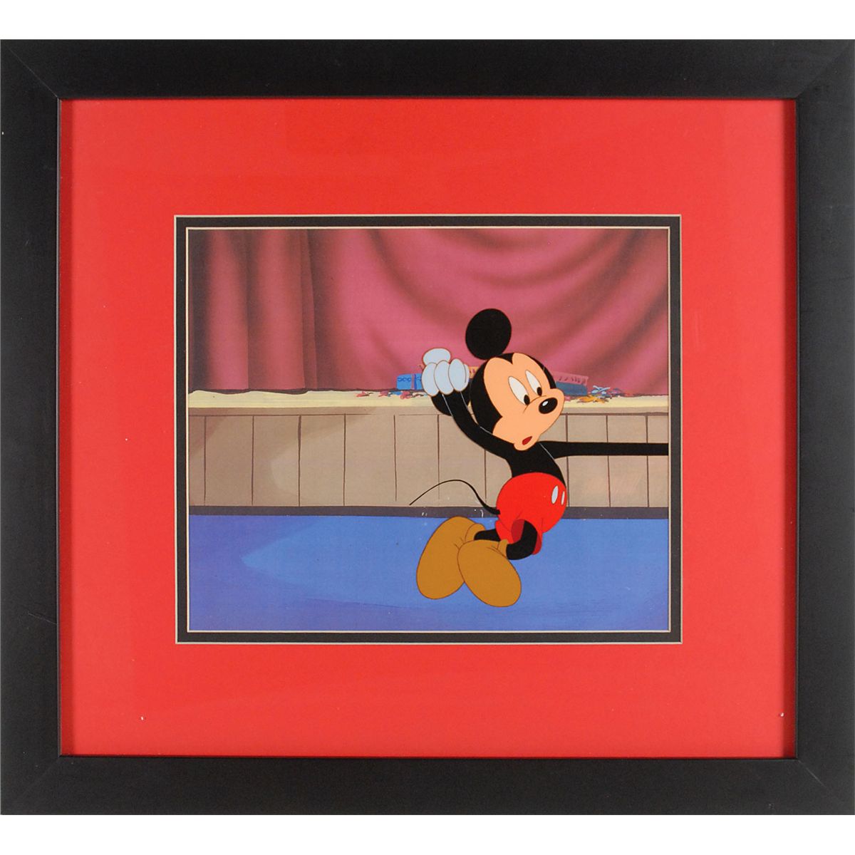 (Walt Disney Studios, Circa 1980s) Original production cel featuring Mickey Mouse from a Disney television cartoon. The cel is placed on a color copy background. Image measures 5.5 x 6.5, with a mat opening of 10.5 x 8.75. This piece is also framed to an overall size of 18.75 x 17. In fine condition.