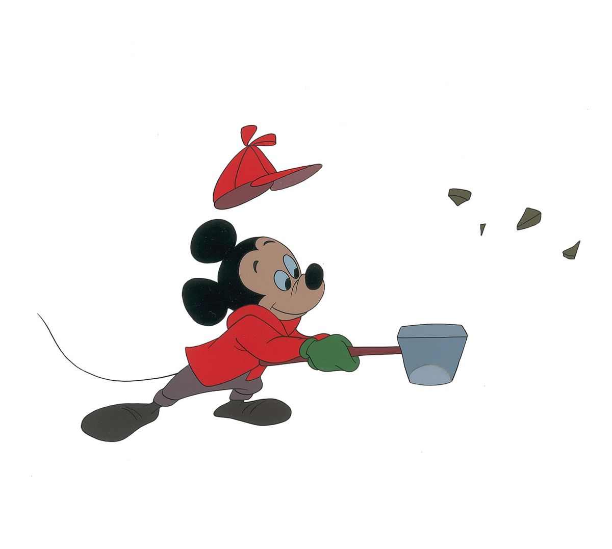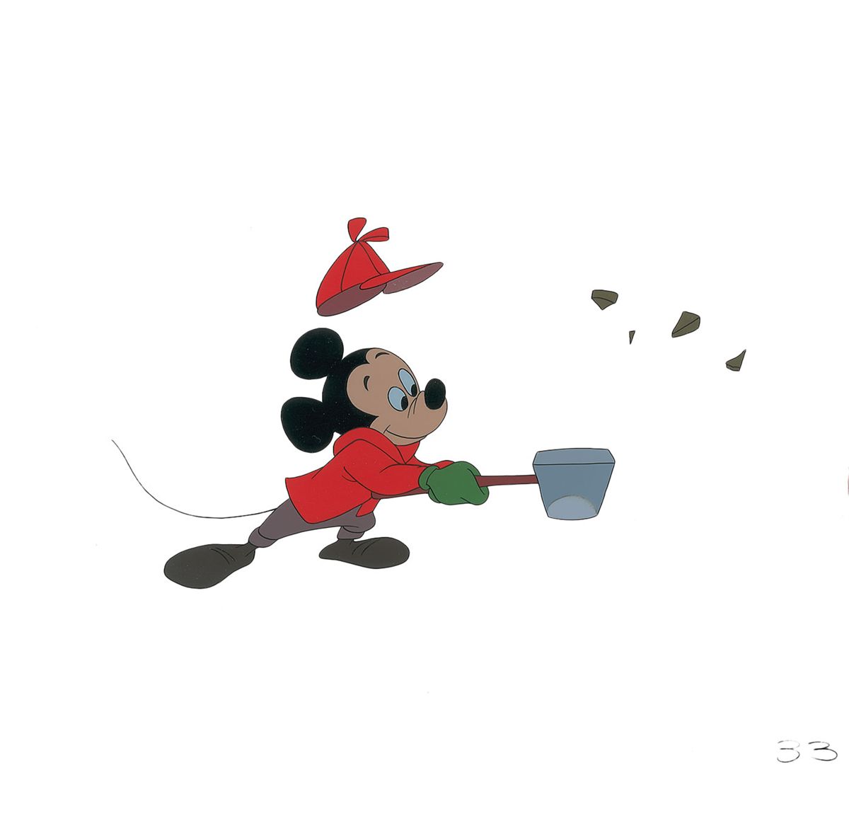 (Walt Disney Studios, 1952) Original production cel featuring Mickey Mouse from Pluto’s Christmas Tree. Full-length image of Mickey swinging an ax measures 8.25 x 5, with overall dimensions of 12 x 9. In fine condition.