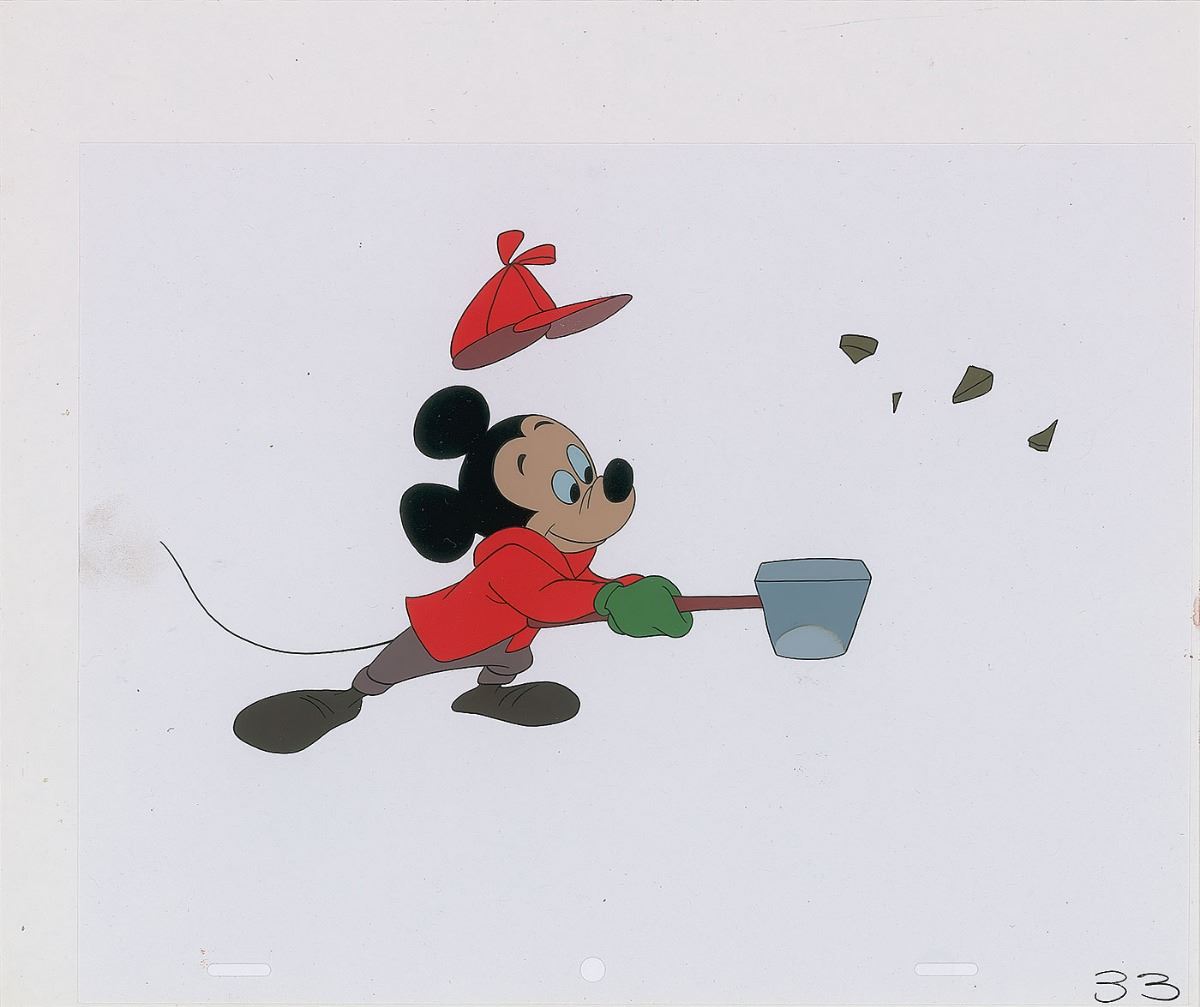 (Walt Disney Studios, 1952) Original production cel featuring Mickey Mouse from Pluto’s Christmas Tree, showing the iconic mouse in lumberjack attire and swinging an axe as bits of wood jump in the air. Total image measures 9 x 5, with overall dimensions of 11.75 x 10. In fine condition.