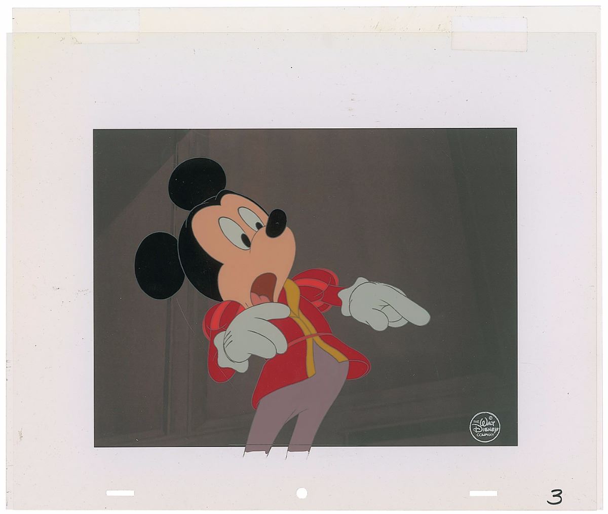(Walt Disney Studios, 1990) Original production cel featuring Mickey Mouse from Prince and the Pauper, showing him looking very surprised. The cel is placed on a color copy background. Image measures 6.5 x 6.25, with overall dimensions of 13 x 11. The piece has the silver Walt Disney Company seal to lower right. In fine condition, with trivial soiling to celluloid.