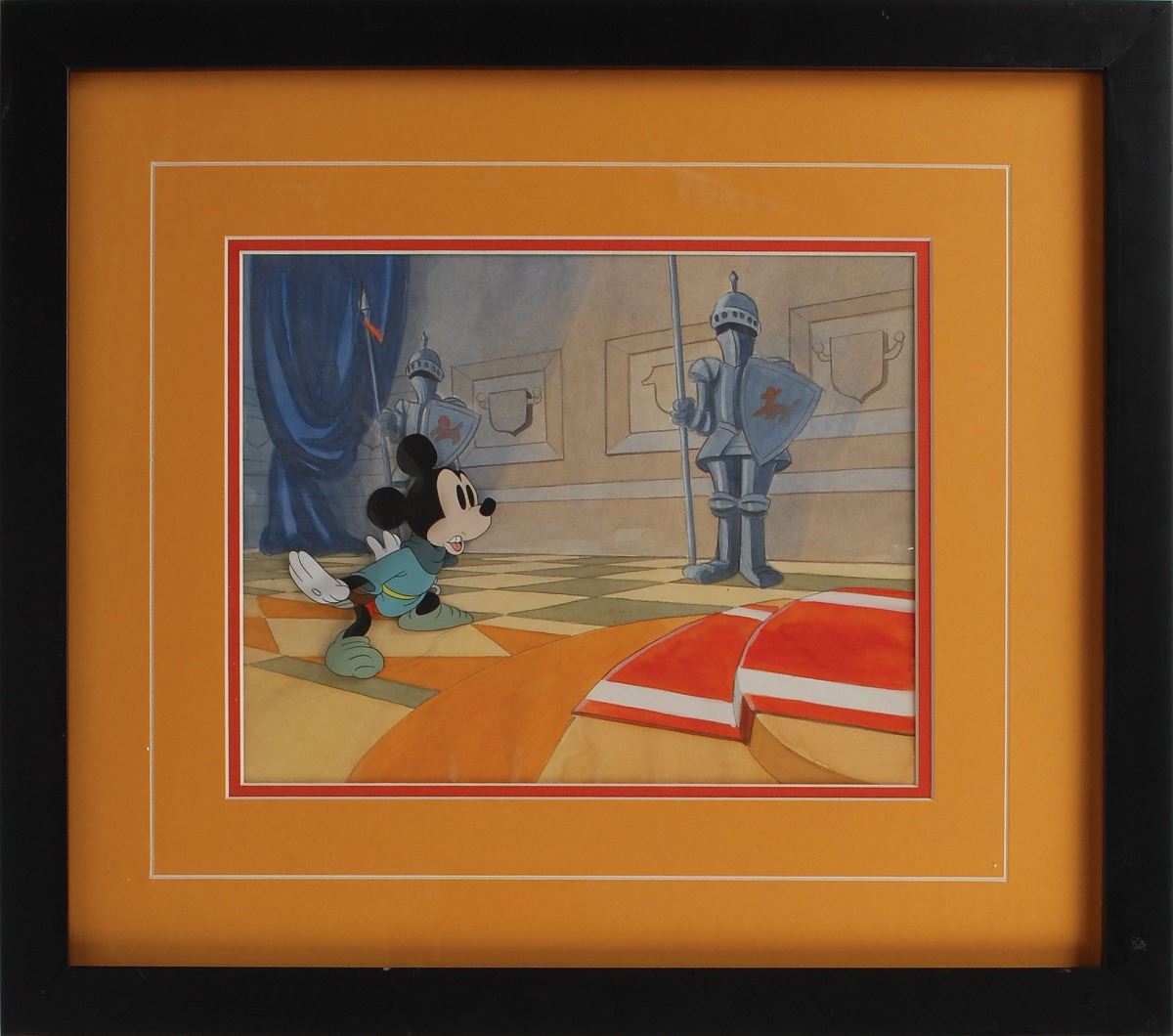 (Walt Disney Studios, 1938) Original production cel of Mickey Mouse from the short film Brave Little Tailor, depicting the young peasant tailor during his pivotal meeting in the king’s throne room. The cel is placed on a hand-painted custom prepared background. Image measures 3.5 x 4, with a mat opening of 11.5 x 9. This piece is also framed to an overall size of 20 x 17.5. In fine condition. Brave Little Tailor was nominated for an Oscar at the 11th Academy Awards in 1939, but lost to Disney's own Ferdinand the Bull for the Best Animated Short Film prize. A wonderful scene from this classic Mickey adventure.