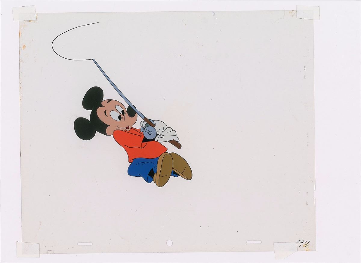 (Walt Disney Studios, 1953) Original production cel featuring Mickey Mouse from The Simple Things, showing the beloved character fishing. Image measures 5.5 x 7, with overall dimensions of 12 x 10. In fine condition. This was a historically significant cartoon, as it represented the final regular entry in the Mickey Mouse series of theatrical shorts.
