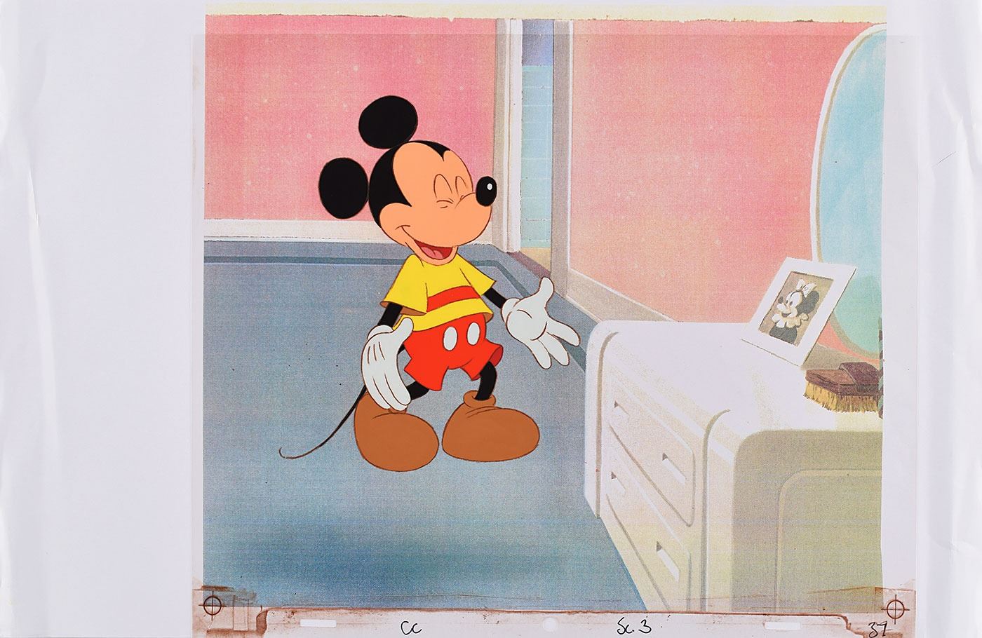 (Walt Disney Studios, circa 1980s) Original production cel featuring Mickey Mouse from a Disney television show, showing the iconic mouse in a yellow shirt and his classic red trousers, looking at a picture of Minnie on his dresser. The cel is placed on a color copy background. Image measures 4.5 x 6.5, with overall dimensions of 17 x 11. In fine condition.