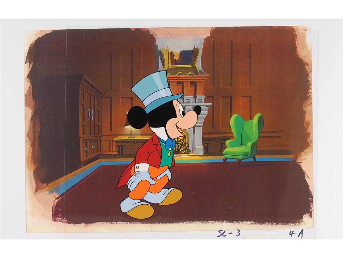 (Walt Disney Studios, 1983) Original production cel featuring Mickey Mouse dressed as Bob Cratchit from a television commercial used to promote the Mickey's Christmas Carol cartoon. The cel is placed on a color copy background. Image measures 4 x 7.5, with an overall size of 17 x 11. In fine condition.