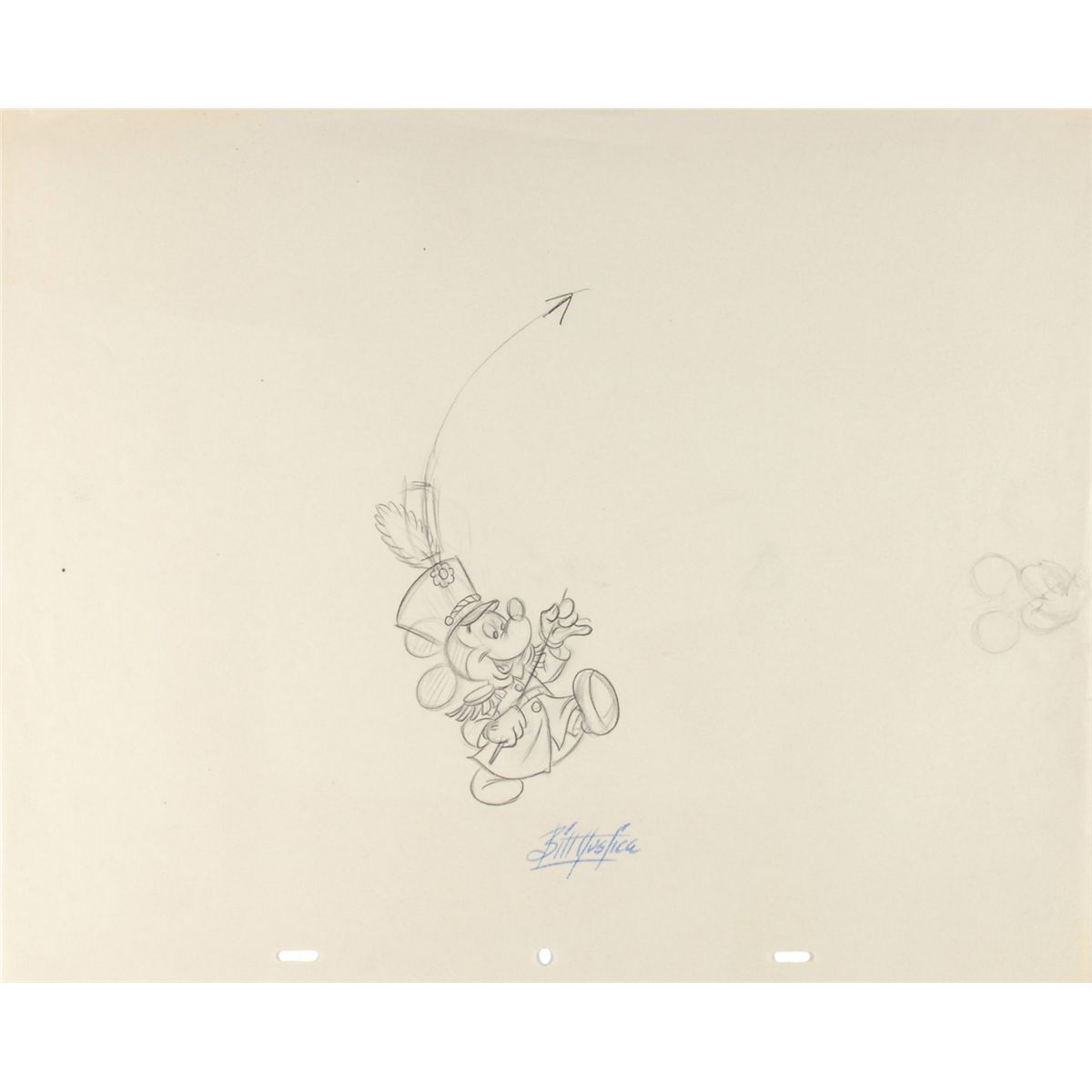(Walt Disney Studios, Circa 1955–57) Original production drawing featuring Mickey Mouse in a bandleader costume designed for a Disneyland Building, signed at the bottom in blue by Bill Justice. Accomplished in graphite on untrimmed 15.5 x 12.5 animation paper. Image measures 3 x 5. In fine condition.