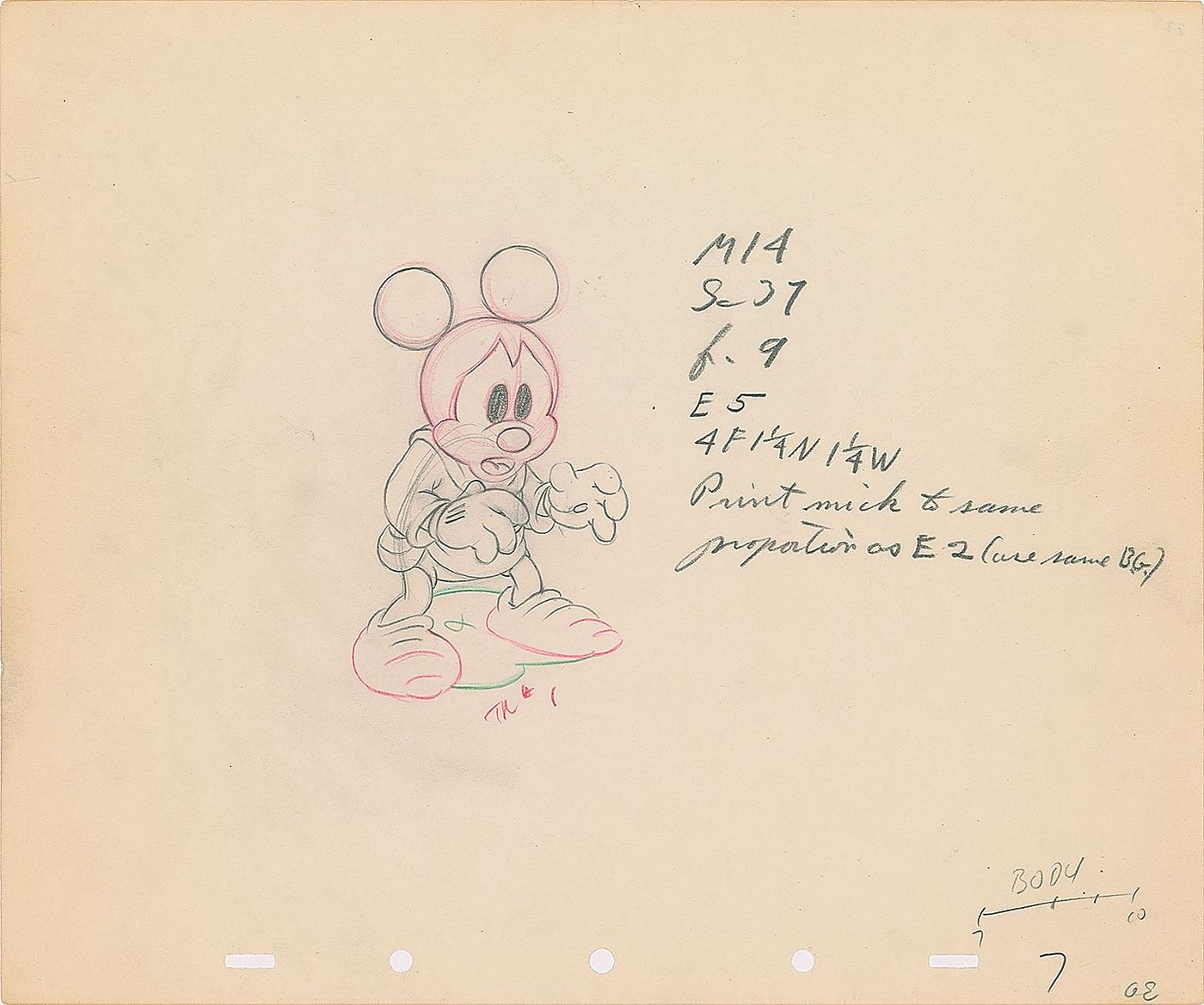 (Walt Disney Studios, 1938) Original production drawing featuring Mickey Mouse from the classic Brave Little Tailor, annotated with production notations to the right side. Accomplished in graphite and colored pencil on untrimmed 12 x 10 animation paper. Image measures 2.75 x 4.5. In fine condition. Brave Little Tailor was nominated for the Academy Award for Best Animated Short Film in 1939, but lost to Disney's own Ferdinand the Bull.