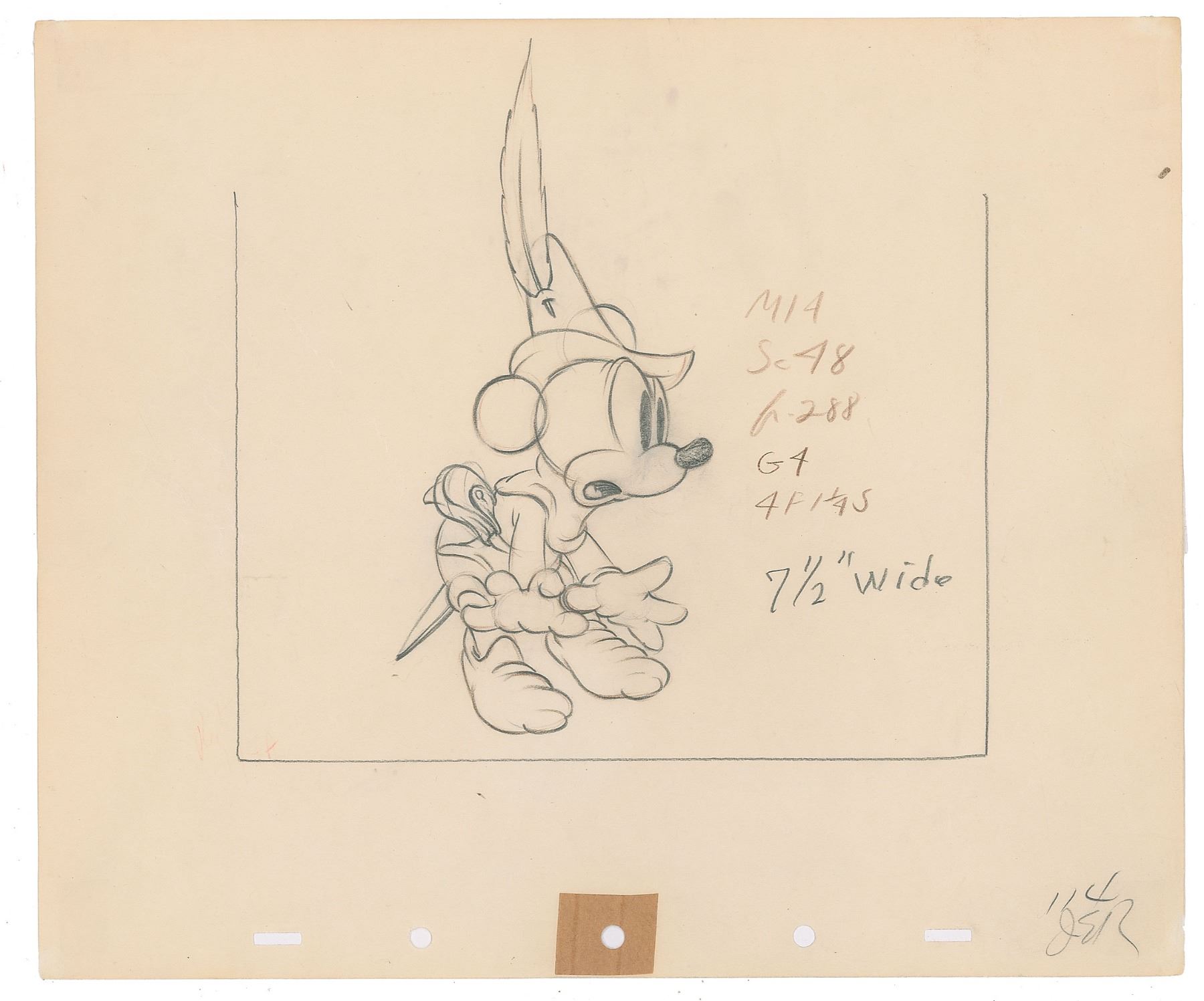 (Walt Disney Studios, 1938) Original production drawing featuring Mickey Mouse from Brave Little Tailor, showing him dressed in his medieval attire with a great expression on his face. Accomplished in graphite on untrimmed 12 x 10 animation paper, marked "114" in the lower right. Image measures 3.5 x 7.25 In fine condition. A superb full-figure pose of the beloved mouse from a popular short.