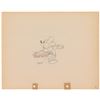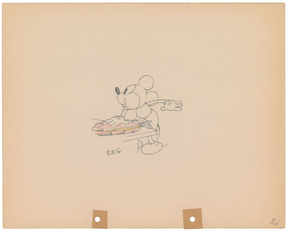 (Walt Disney Studios, 1933) Original production drawing featuring Mickey Mouse from Building a Building, showing the whistling rodent in the midst of making a large fish sandwich. Accomplished in graphite and colored pencil on untrimmed 12 x 9.5 animation paper. Image measures 3.75x 3.25. In fine condition.