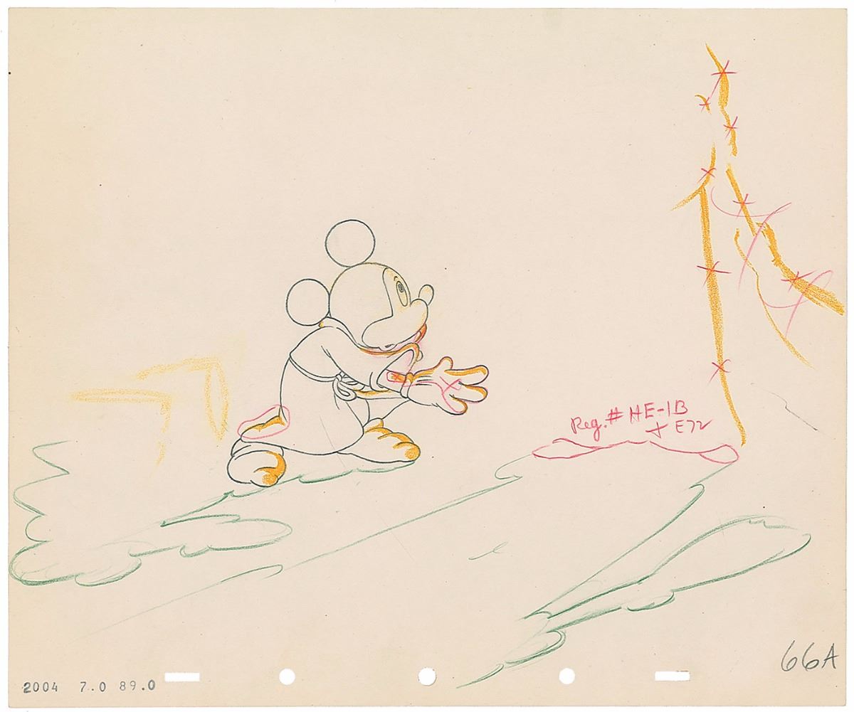 (Walt Disney Studios, 1940) Original production drawing featuring Mickey Mouse as the sorcerer’s apprentice from Fantasia, portraying him without his magical hat while making a cautious approach. Accomplished in graphite and colored pencil on untrimmed 12 x 10 animation paper. Character image measures 3.75 x 4, with a total image size of 12 x 9. In fine condition.