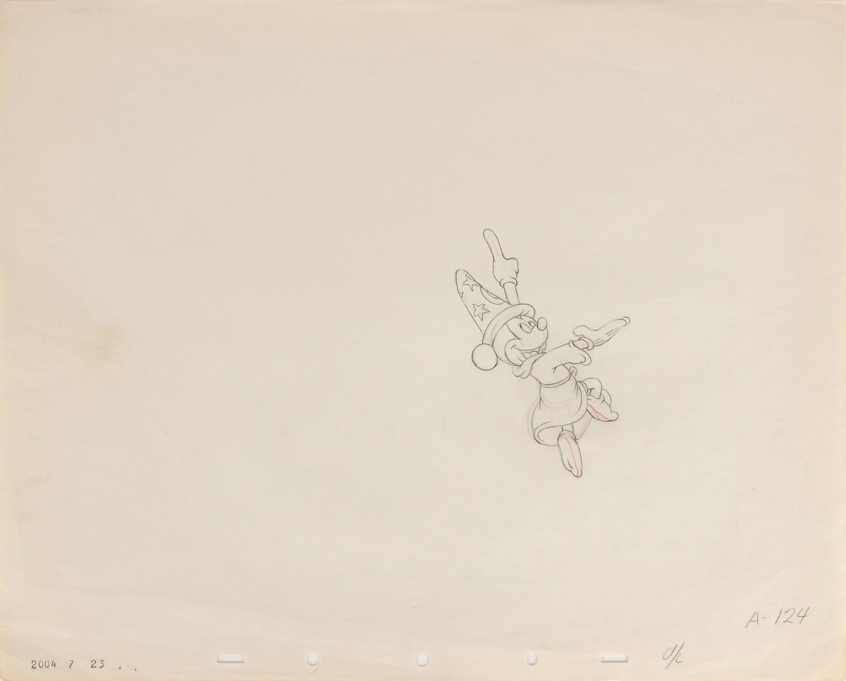 (Walt Disney Studios, 1940) Original production drawing featuring Mickey Mouse as the ‘Sorcerer’s Apprentice’ from Fantasia, showing him in an energetic pose while wearing the sorcerer’s hat. Accomplished in graphite and colored pencil on untrimmed 15.5 x 12.5 animation paper. Image measures 3.25 x 4.75. In fine condition.
