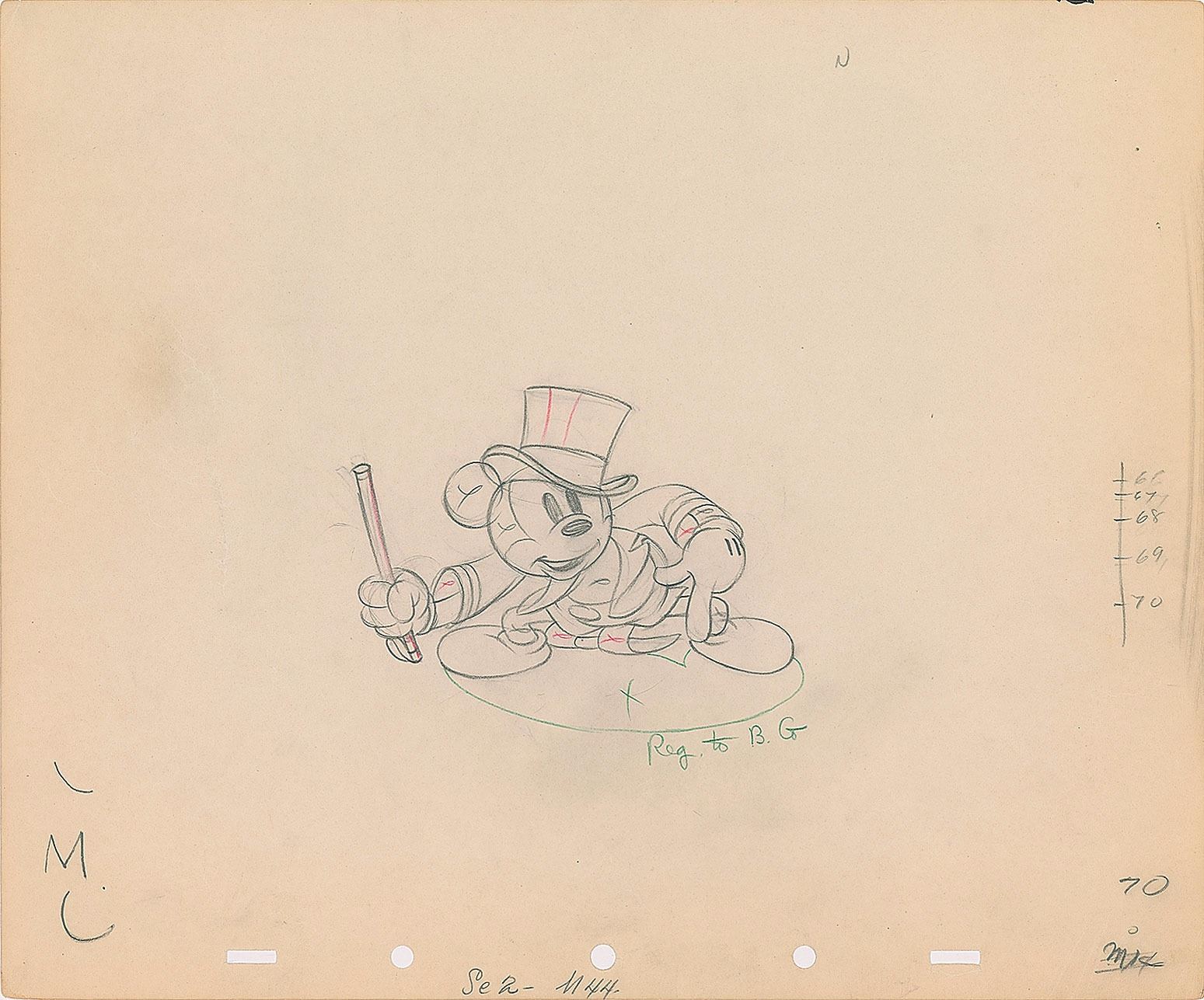 (Walt Disney Studios, 1936) Original production drawing featuring Mickey Mouse from Mickey’s Circus, showing the iconic Disney character as a circus ringleader. Accomplished in graphite and colored pencil on untrimmed 12 x 10 animation paper. Image measures 4.5 x 3.5. In fine condition.