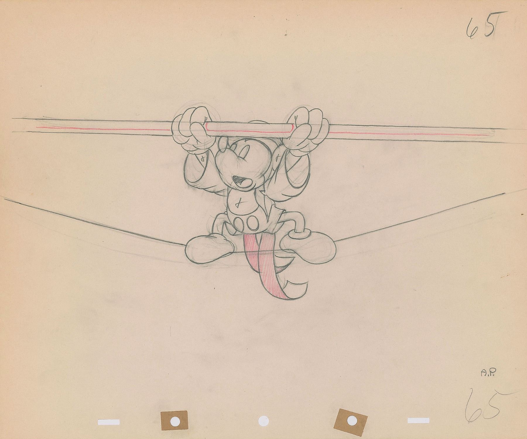 (Walt Disney Studios, 1936) Wonderful original production drawing featuring Mickey Mouse from Mickey's Circus, showing the ringmaster mouse balancing on a tightrope after having been shot from a cannon with Donald Duck. Accomplished in graphite and colored pencil on untrimmed 12 x 10 animation paper, marked "65" in the right corners. Image measures 11.5 x 4.5. In fine condition.