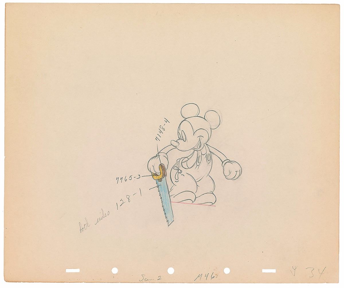 (Walt Disney Studios, 1936) Original production drawing featuring Mickey Mouse from Mickey’s Elephant, depicting carpenter Mickey in overalls with saw in hand. Accomplished in graphite and colored pencil on untrimmed 12 x 10 animation paper. Image measures 3.25 x 4.25. In fine condition.
