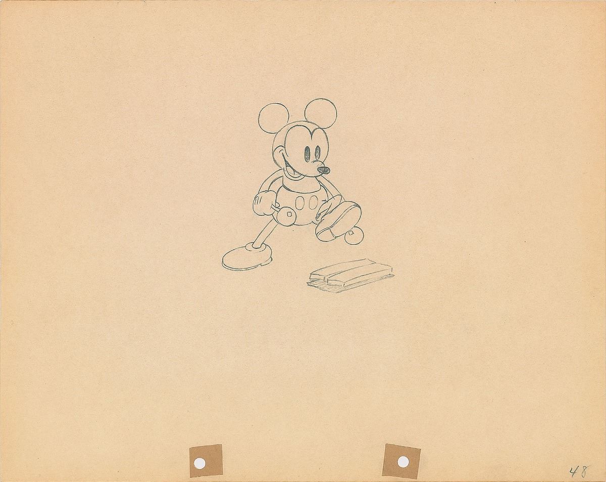 (Walt Disney Studios, 1933) Original production drawing from Mickey’s Gala Premiere, depicting Mickey with mallets while playing atop a xylophone. Accomplished in graphite on untrimmed 12 x 9.5 animation paper. Image measures 3.5 x 3.75. In fine condition.