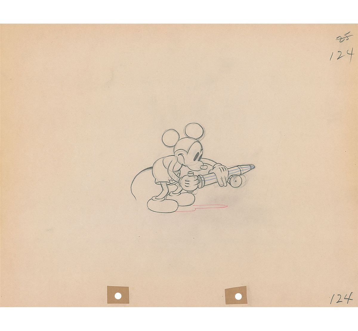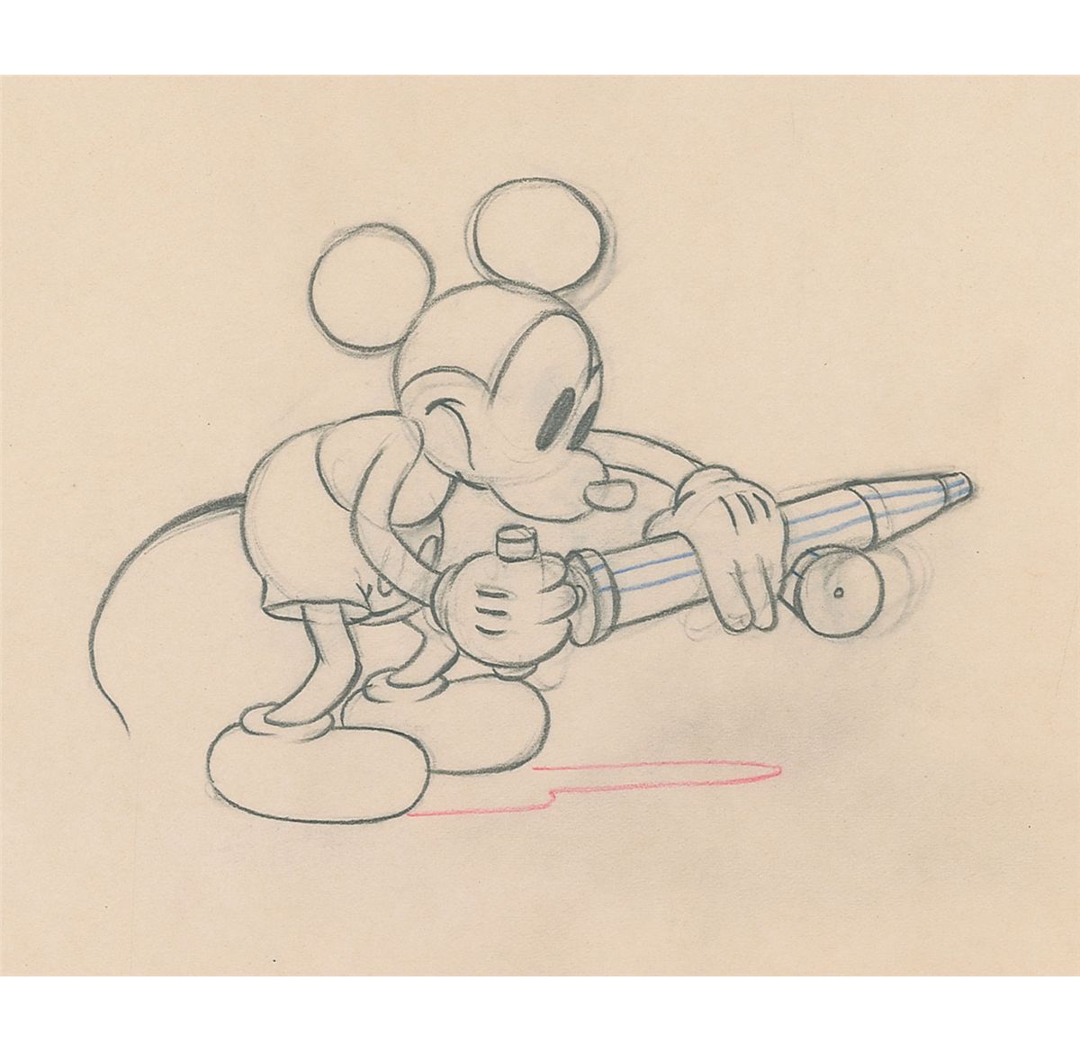 (Walt Disney Studios, 1935) Original production drawing featuring Mickey Mouse from Mickey’s Garden. Accomplished in graphite on untrimmed 12 x 9.5 animation paper. Image measures 4.5 x 3 and shows Mickey holding a bug sprayer. In fine condition, with a few vertical creases. Released in 1935, this short was just the second color Mickey Mouse cartoon produced by Disney.