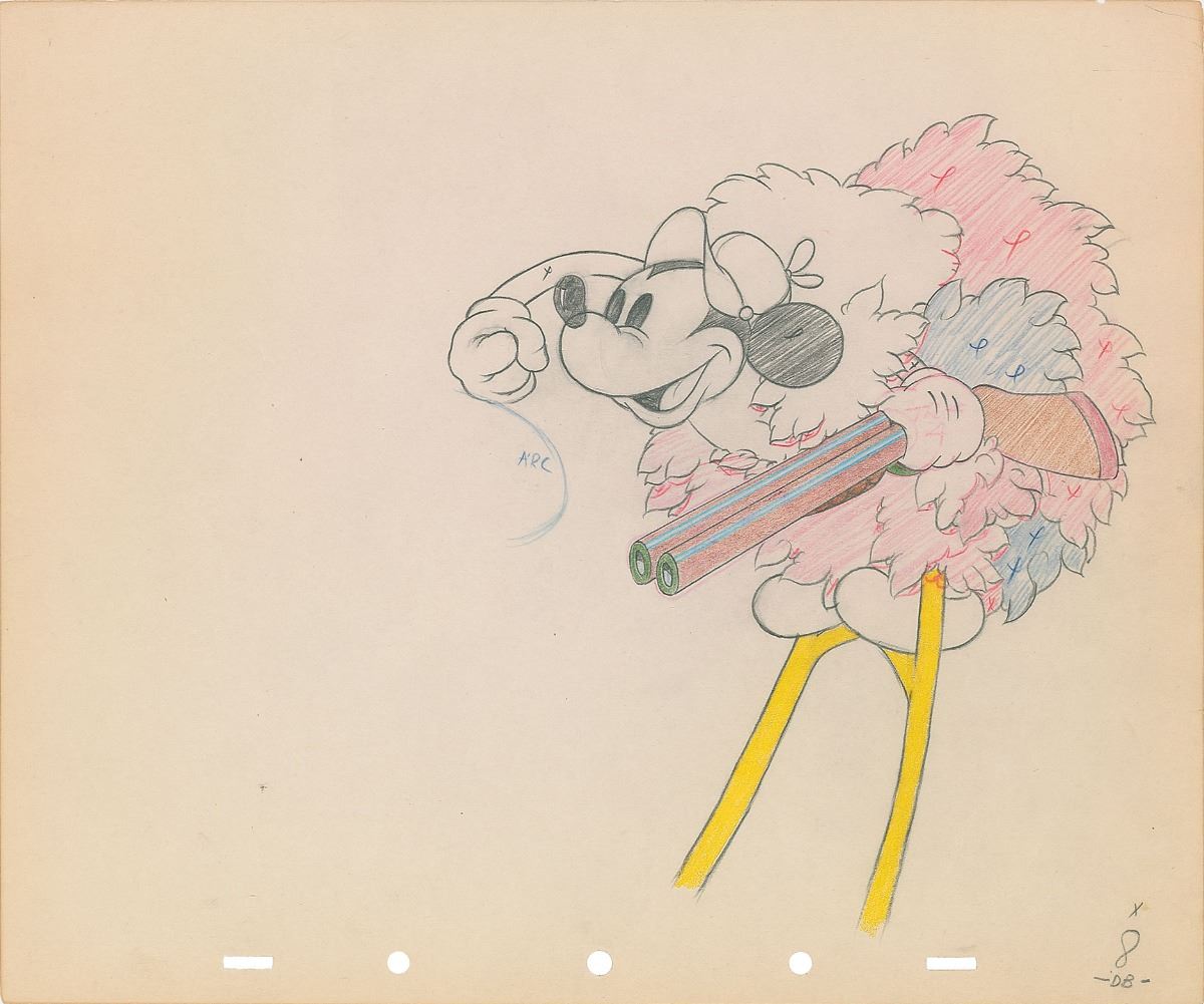 (Walt Disney Studios, 1937) Original production drawing featuring Mickey Mouse from Moose Hunters, showing him camouflaged as a bush on stilts. Accomplished in graphite and colored pencil on untrimmed 12 x 10 animation paper. Image measures 7 x 8. In fine condition.