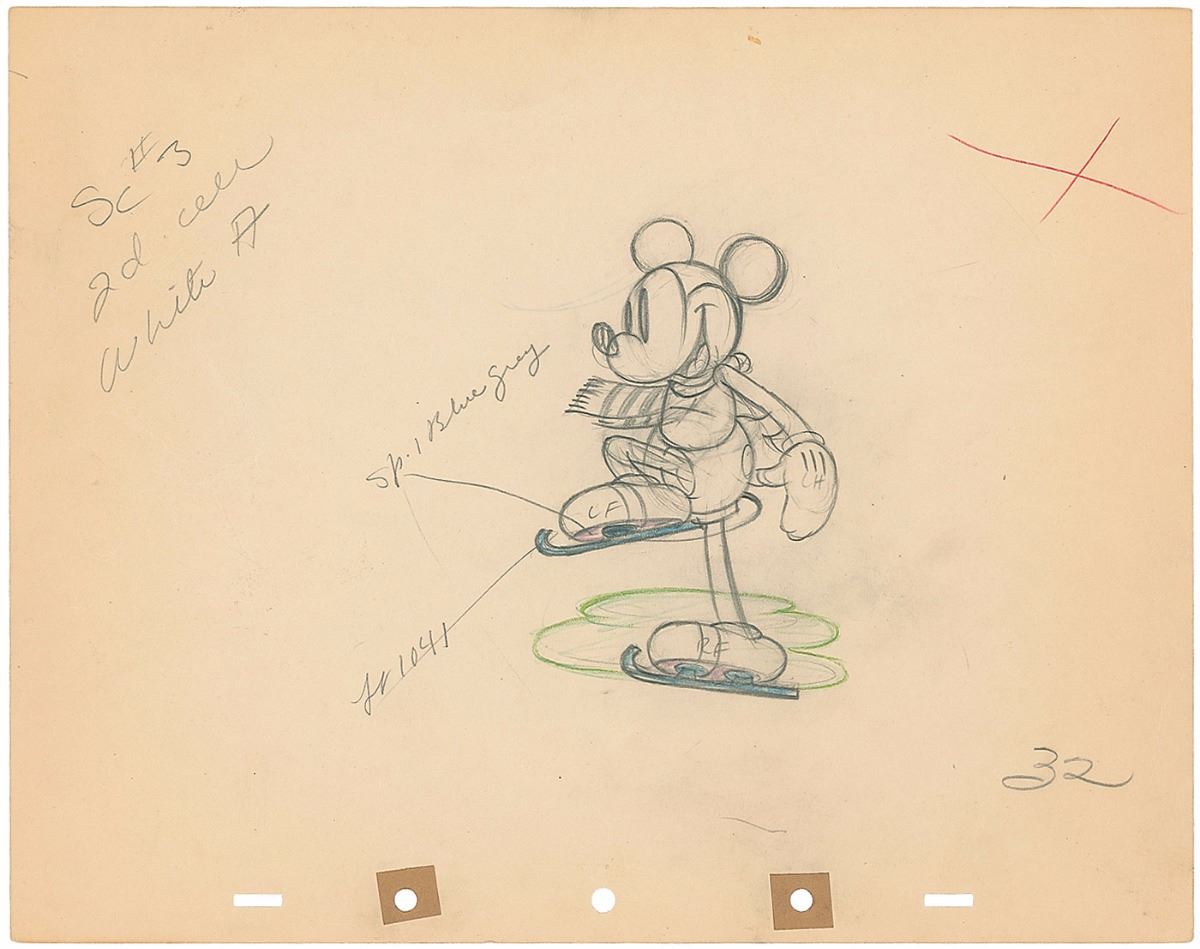 (Walt Disney Studios, 1935) Original production drawing featuring Mickey Mouse from On Ice, showing him skating in wintertime. Accomplished in graphite and colored pencil on untrimmed 12 x 9.5 animation paper, which also bears several interesting production notations to denote colors. Image measures 3.25 x 4.75. In fine condition.