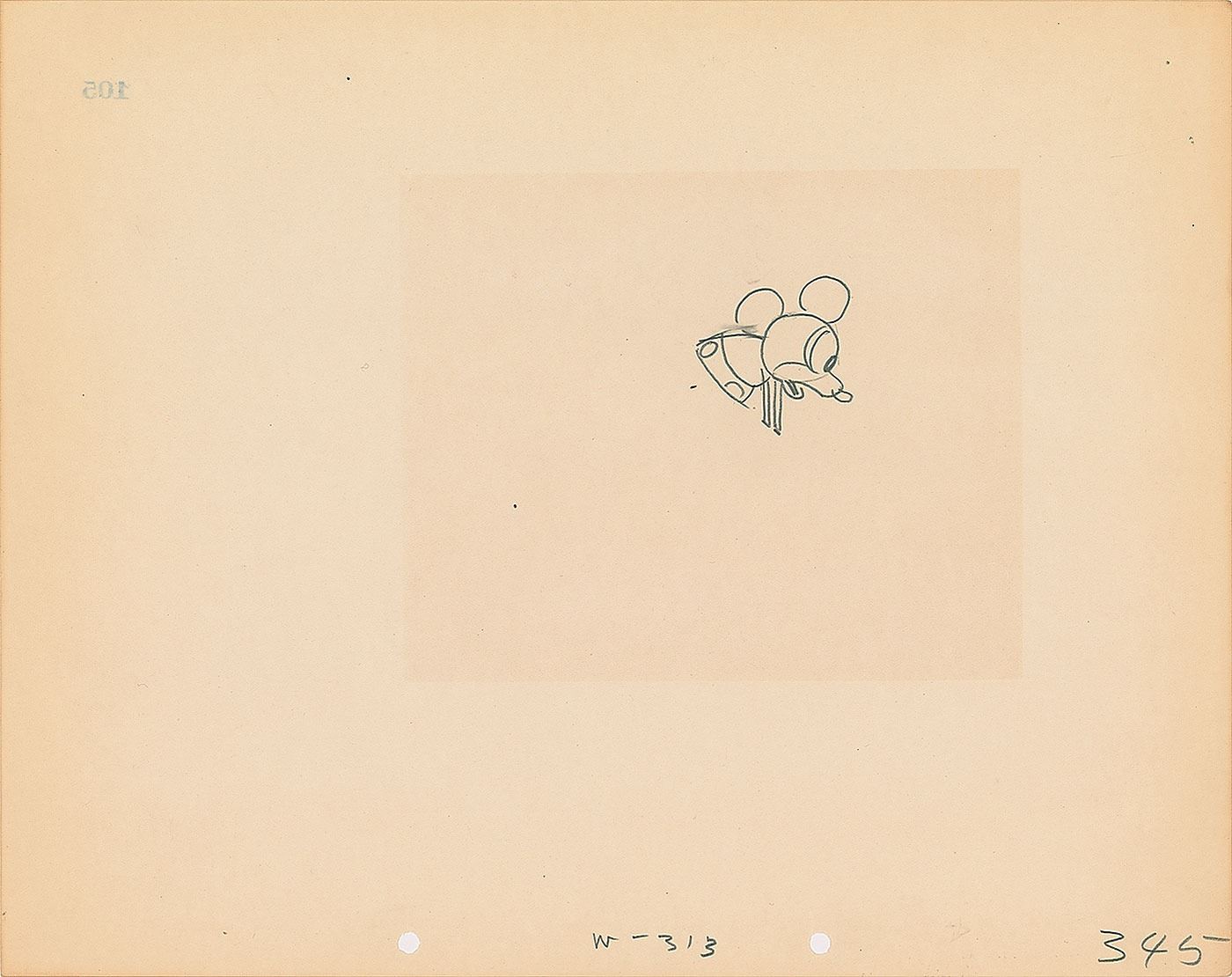 (Walt Disney Studios, 1928) Original production drawing featuring Mickey Mouse from Plane Crazy, drawn by Ub Iwerks, showing him in an exasperated state. Accomplished in graphite on untrimmed 12 x 9.5 animation paper. Image measures 1.5 x 1.5. In fine condition. Plane Crazy was extremely significant in the history of animation, as it marked the creation of Mickey Mouse. The short was co-directed by Walt Disney and Ub Iwerks, with Iwerks serving as the main animator. Plane Crazy was a silent film and given a test screening to a theater audience, but failed to pick up a distributor; later in 1928 Disney released Steamboat Willie as a very successful sound cartoon, which is generally considered Mickey's debut despite being made after Plane Crazy.