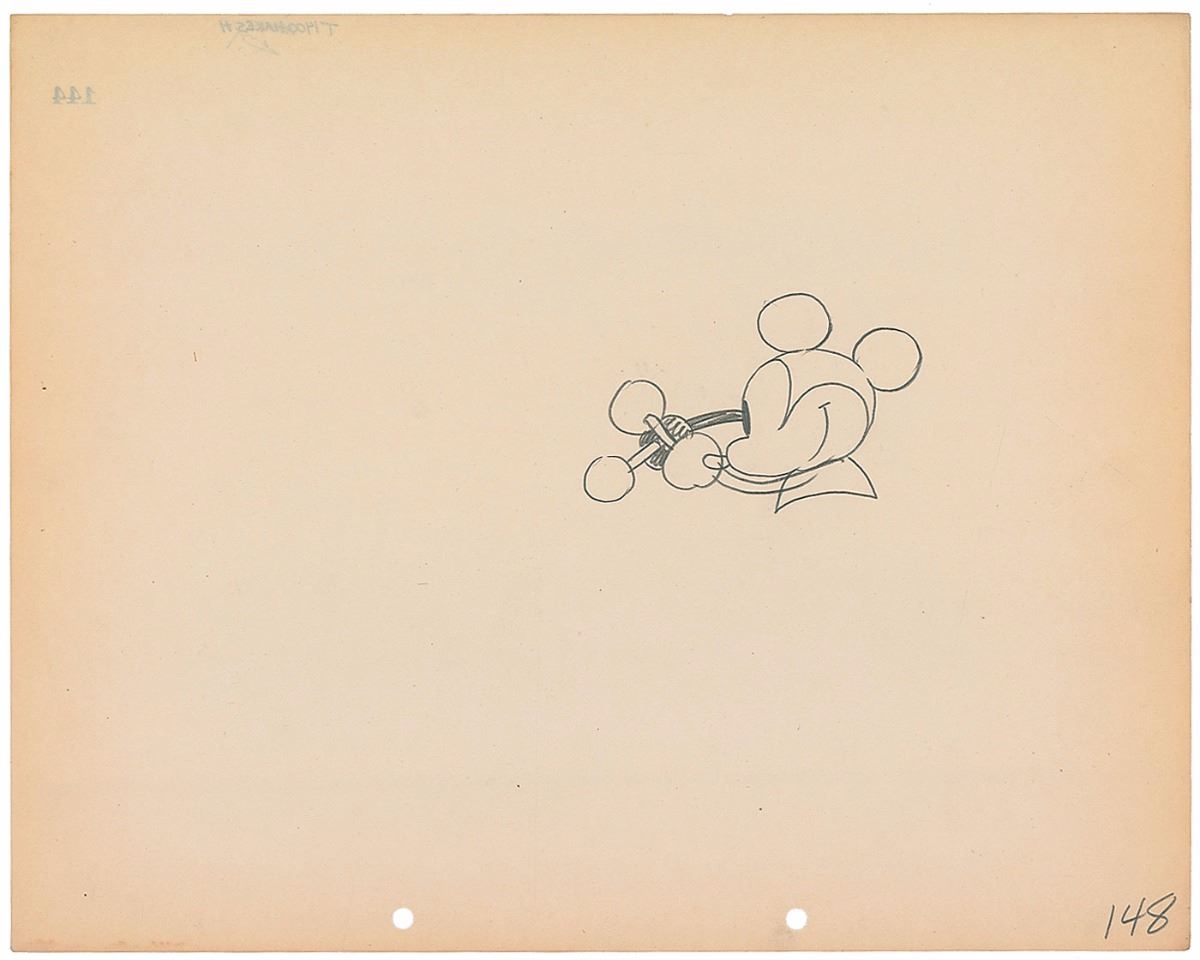 (Walt Disney Studios, 1928) Original production drawing by Ub Iwerks featuring Mickey Mouse from Steamboat Willie, showing him holding a pair of drum mallets. Accomplished in graphite on untrimmed 12 x 9.5 animation paper. Image measures 3.5 x 2.25. In fine condition, with slight toning to edges. Directed by Walt Disney and Iwerks, Steamboat Willie holds the distinction of being the first Disney cartoon with synchronized sound, including character sounds and a musical score.