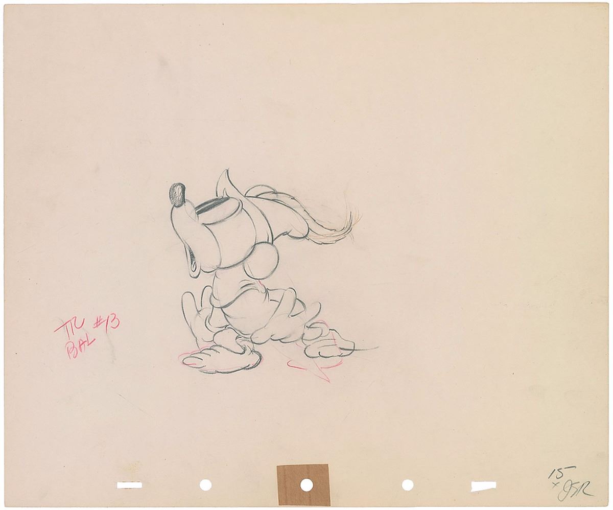 (Walt Disney Studios, 1938) Original production drawing featuring Mickey Mouse from The Brave Little Tailor. Accomplished in graphite and colored pencil on untrimmed 12 x 10 animation paper. Image measures 3.5 x 4. In fine condition.