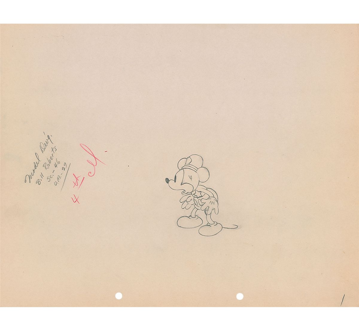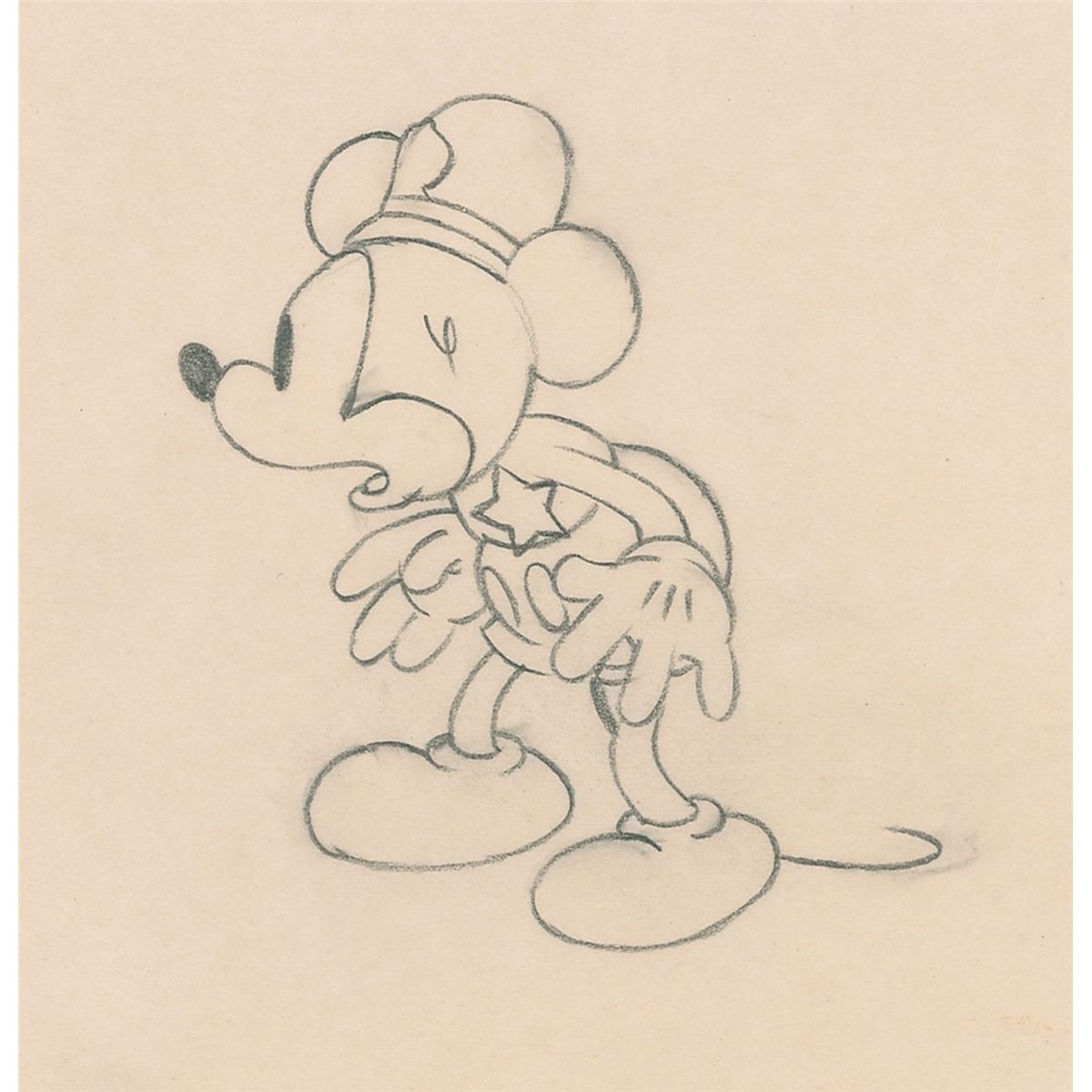 (Walt Disney Studios, 1934) Original production drawing featuring Mickey Mouse from The Dognapper. Accomplished in graphite on untrimmed 12 x 9.5 animation paper. Image measures 2.25 x 3 and shows Mickey in a police hat and badge. In fine condition.