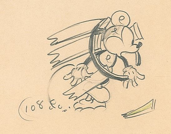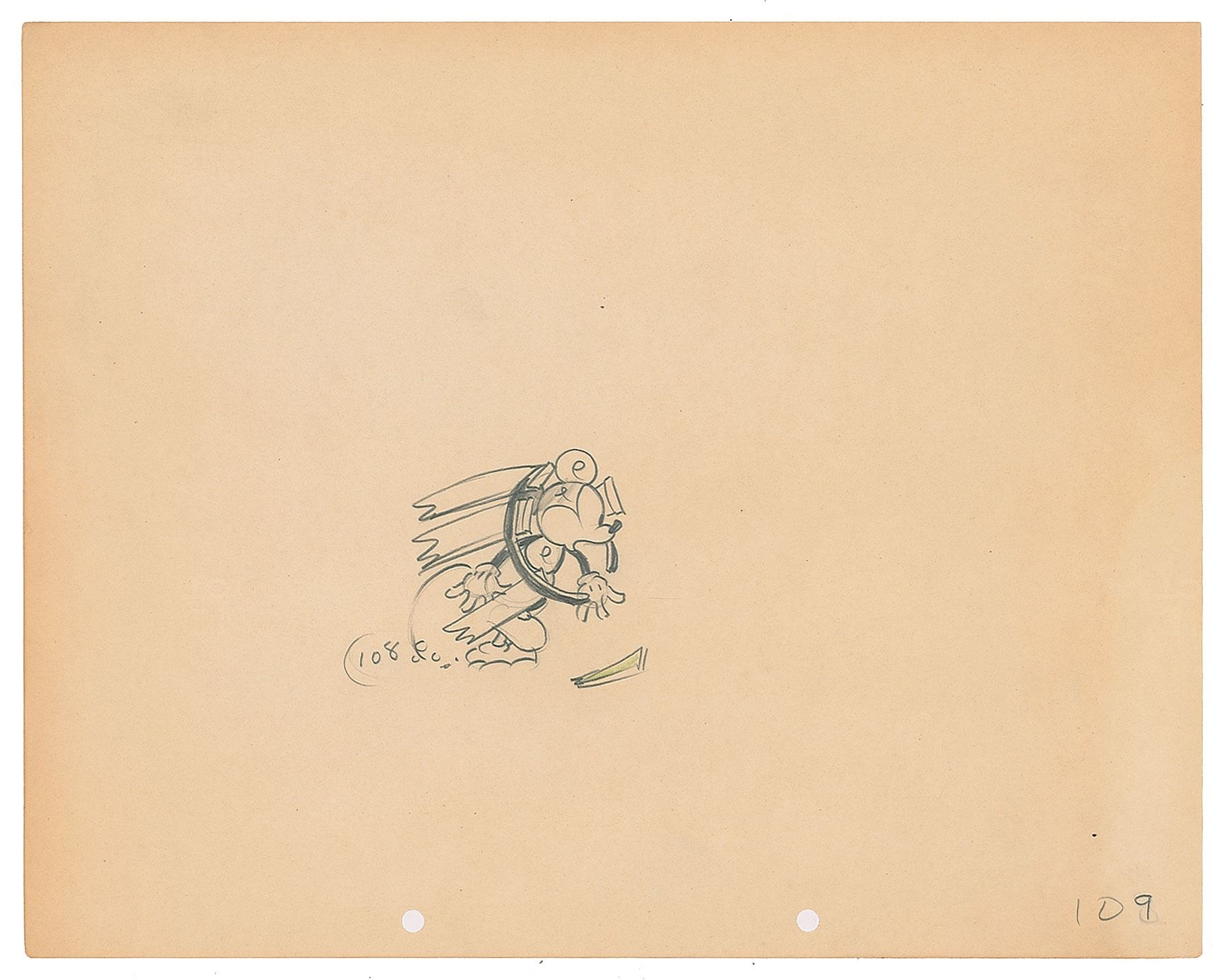 (Walt Disney Studios, 1932) Original production drawing of Mickey Mouse from The Klondike Kid, which shows remnants of a broken barrel hanging from Mickey as he begins his pursuit of Pete and the captured Minnie. Accomplished in graphite and colored pencil on untrimmed 12 x 9.5 animation paper, marked in the lower right corner, "109." Image measures 3 x 2.5. In fine condition.