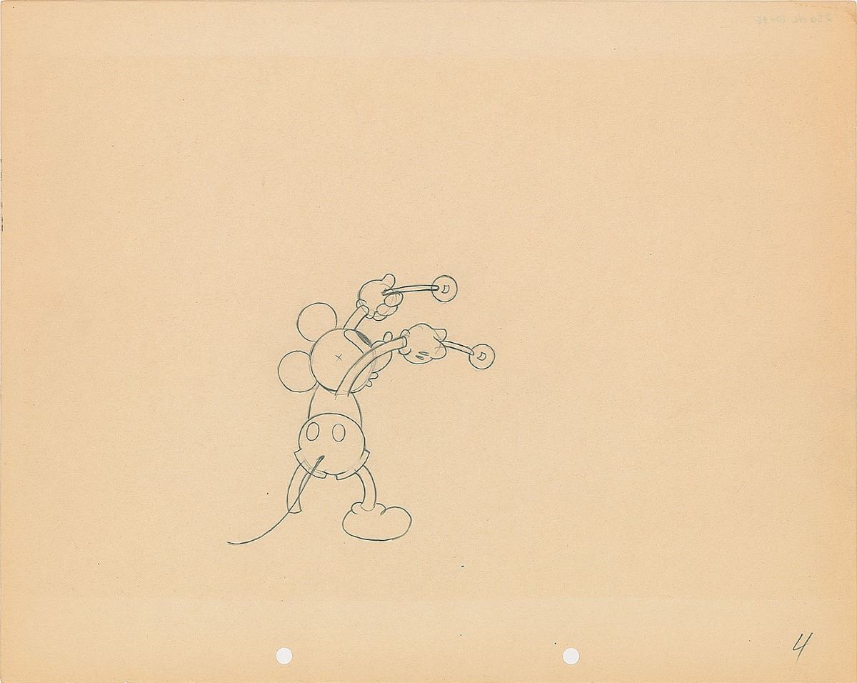 (Walt Disney Studios, 1932) Original production drawing from The Whoopee Party, depicting Mickey with a pair of mallets during a scene in which he plays a variety of musical milk bottles. Accomplished in graphite on untrimmed 12 x 9.5 animation paper. Image measures 3.75 x 3.75. In fine condition.