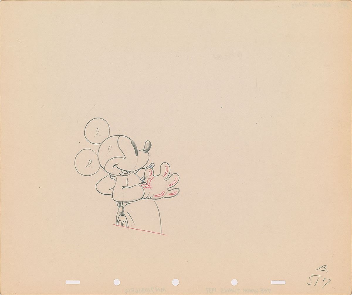 (Walt Disney Studios, 1937) Original production drawing featuring Mickey Mouse in his lab coat from The Worm Turns. Accomplished in graphite and colored pencil on untrimmed 12 x 10 animation paper. Image measures 3.5 x 4. In fine condition.