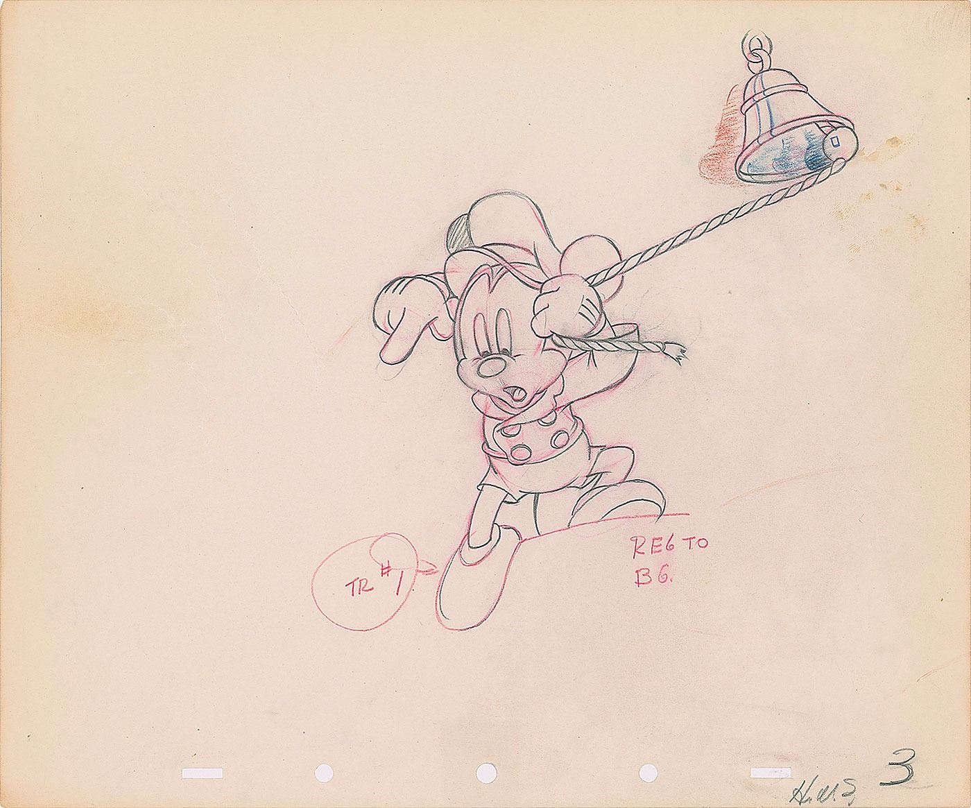 (Walt Disney Studios, 1940) Original production drawing featuring Mickey Mouse ringing a bell from Tugboat Mickey. Accomplished in graphite and colored pencil on untrimmed 12 x 10 animation paper. Image measures 6 x 7.5. In fine condition, with some light soiling.