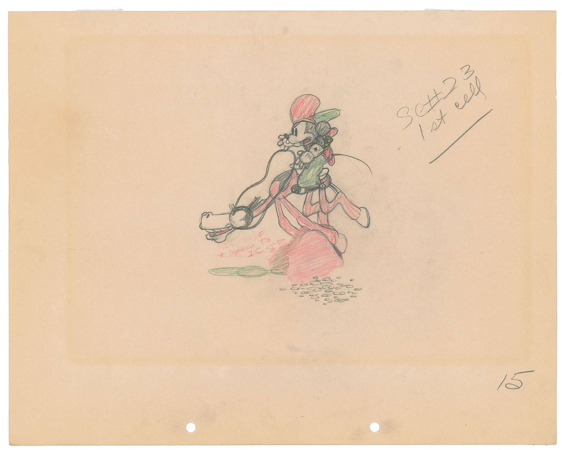 (Walt Disney Studios, 1934) Colorful original production drawing featuring Mickey Mouse from Two-Gun Mickey, showing the cowboy-clad mouse riding his horse in a memorable chase scene. Accomplished in graphite and colored pencil on untrimmed 12 x 9.5 animation paper, marked "15" in the lower right. Image measures 4 x 4.5. In fine condition.