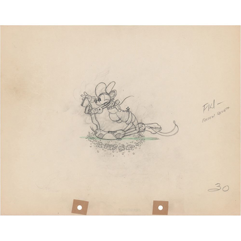 (Walt Disney Studios, 1934) Original production drawing featuring Mickey Mouse from Two-Gun Mickey, showing him as a cowboy falling off his horse. Accomplished in graphite on untrimmed 12 x 9.5 animation paper, marked "30" in the lower corner. Image measures 5 x 3.75. In fine condition.
