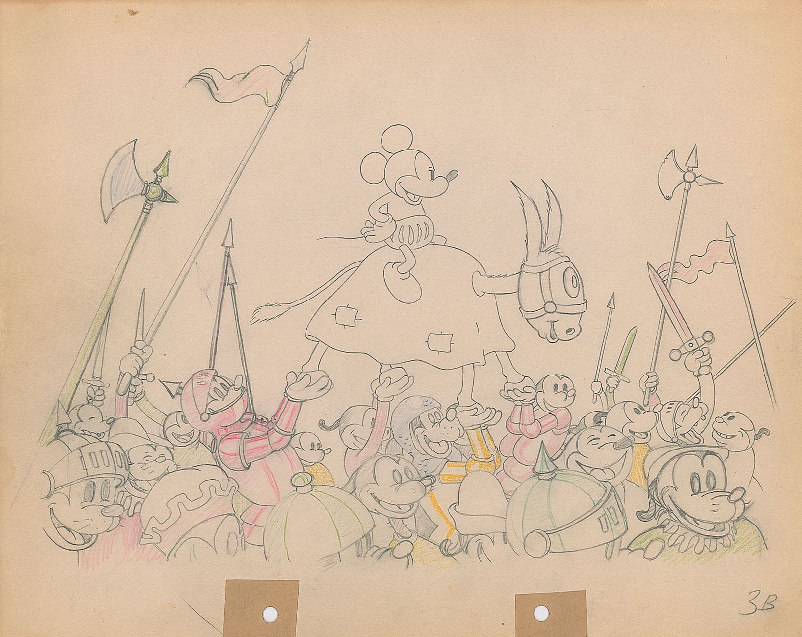 (Walt Disney Studios, 1933) Magnificent original production drawing of Mickey Mouse from the early short film Ye Olden Days, which depicts the minstrel mouse and his courageous donkey being carried by a group of knights after Mickey out-dueled the Prince of Poopapadoo and secured the hand of Princess Minnie. Accomplished in graphite and colored pencil on untrimmed 12 x 9.5 animation paper, marked in the lower right, "3B." Total image measures 11 x 8. In fine condition, with trivial toning to edges. A hugely desirable multi-character scene with enormous display value.