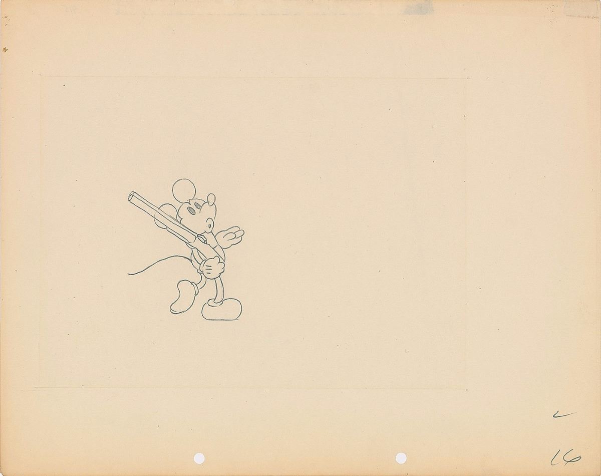 (Walt Disney Studios, circa 1932–1934) Original production drawing featuring Mickey Mouse toting a shotgun and whistling. Accomplished in graphite on untrimmed 12 x 9.5 animation paper. Image measures 2.25 x 3. In fine condition.