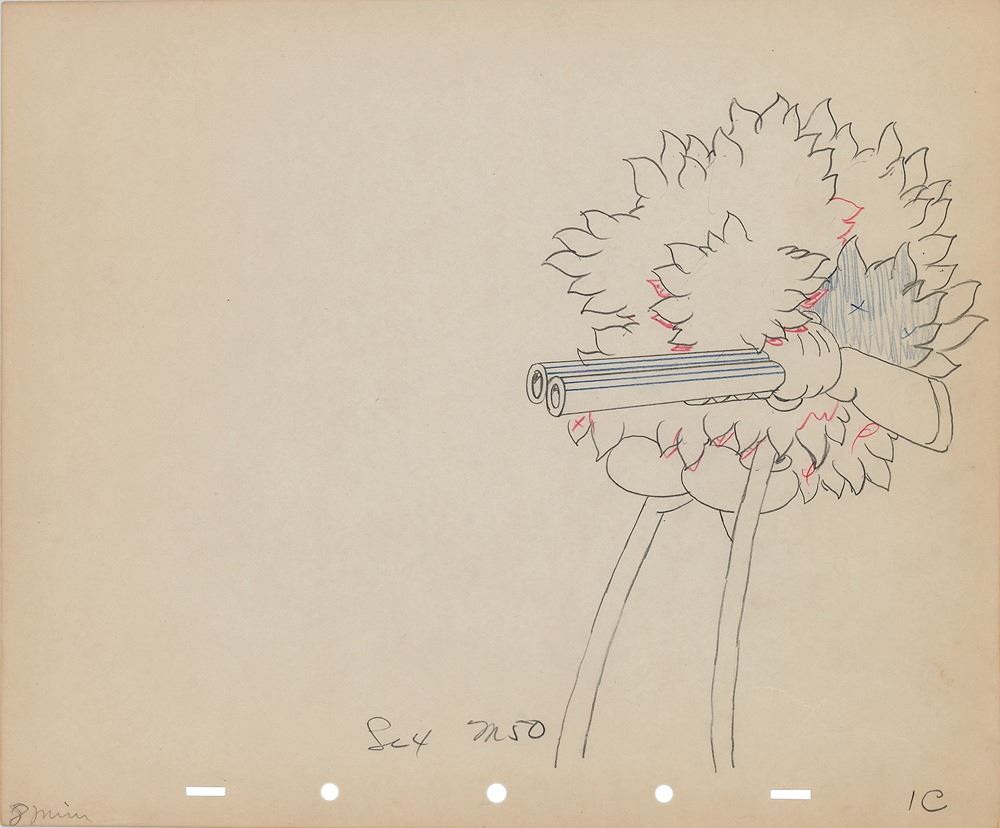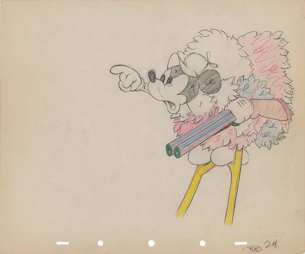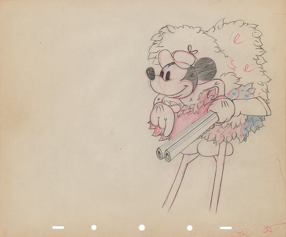 (Walt Disney Studios, 1937) Fantastic group of three original production drawings featuring Mickey Mouse from Moose Hunters, showing the stilt-walking hunter camouflaged as a bush and holding a double-barreled shotgun. Accomplished in graphite and colored pencil on untrimmed 12 x 10 sheets of animation paper, marked in the lower right, "24," "1C," and "35." Images measure from 5 x 8 to 7 x 7.75. In overall fine condition. A wonderful lot of large and attractive drawings of Mickey the outdoorsman.
