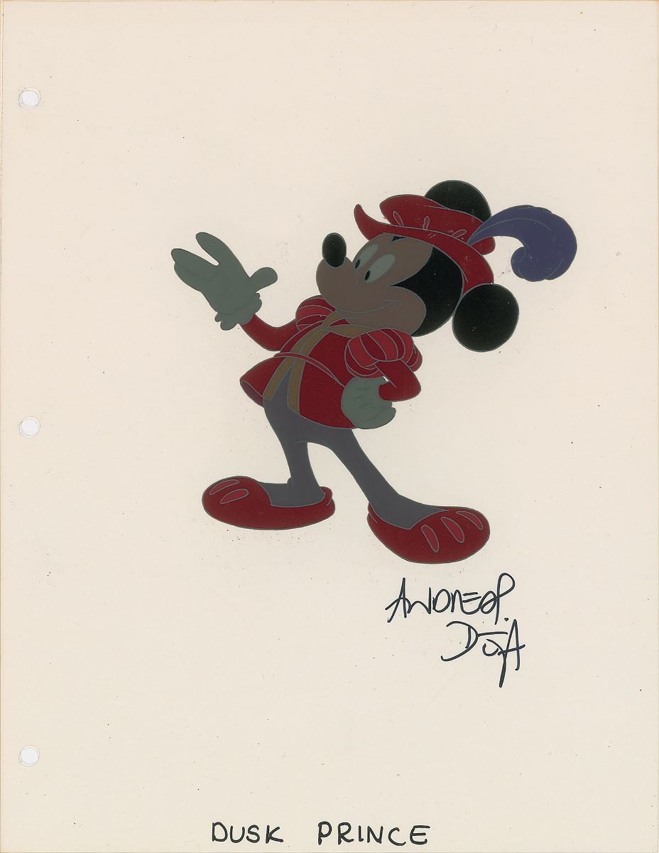 (Walt Disney Studios, 1990) Original production model cel featuring Mickey Mouse as the ‘Dusk Prince’ from The Prince and the Pauper, signed below by Disney animator and legend Andreas Deja. Image measures 5.25 x 5, with overall dimensions of 8.5 x 11. In fine condition.