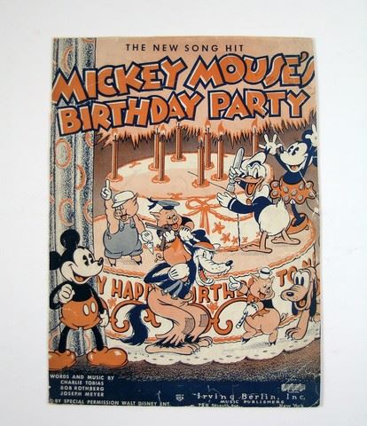 Mickey Mouse's Birthday Party 1935 - Super Rare! Composed for Mickey's Lucky 7th Birthday Bash By Special Permission from Walt Disney Ent. Mickey’s seventh birthday (celebrated on September 28, 1935) was promoted as “Mickey Mouse’s Lucky Seventh Birthday,” and the Disney Studio encouraged theaters to book Mickey Mouse and Silly Symphony cartoons as a special program. In fact, every available print of Disney cartoons was in use during the celebration. Theaters served birthday cake, held costume parties (with free admission for any patron dressed as a Disney character), and there were even adult dinner parties held in cities such as New York and London. A special birthday song, “Mickey Mouse’s Birthday Party,” was composed for the occasion, and recorded by Guy Lombardo and his orchestra.