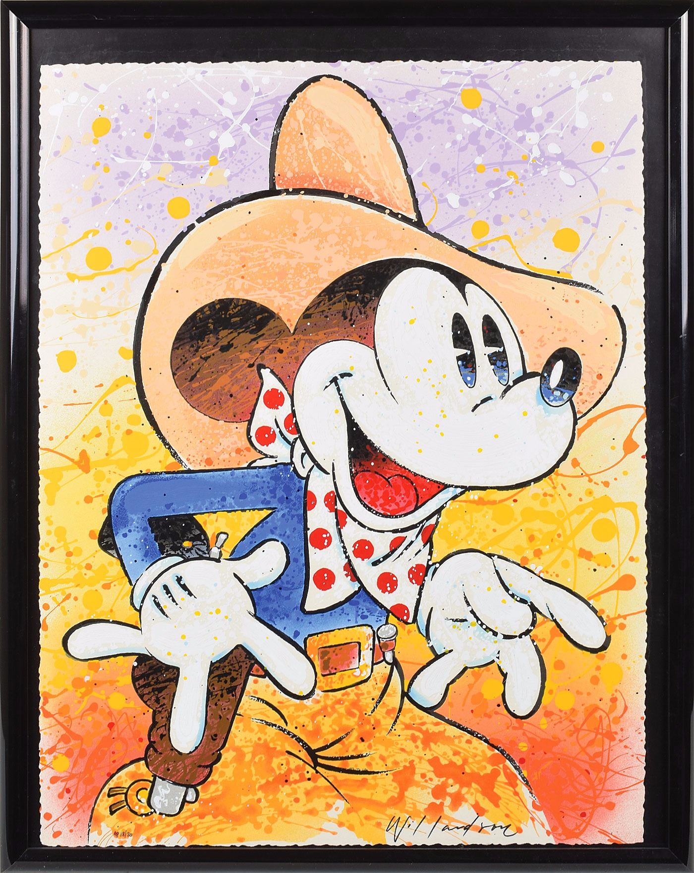 Large color limited edition 20 x 26 serigraph of Mickey Mouse as a cowboy by David Willardson entitled 'The Fastest Draw Out West,' numbered AP18/20, signed in black ink, "Willardson." Framed to an overall size of 23 x 29. In fine condition.