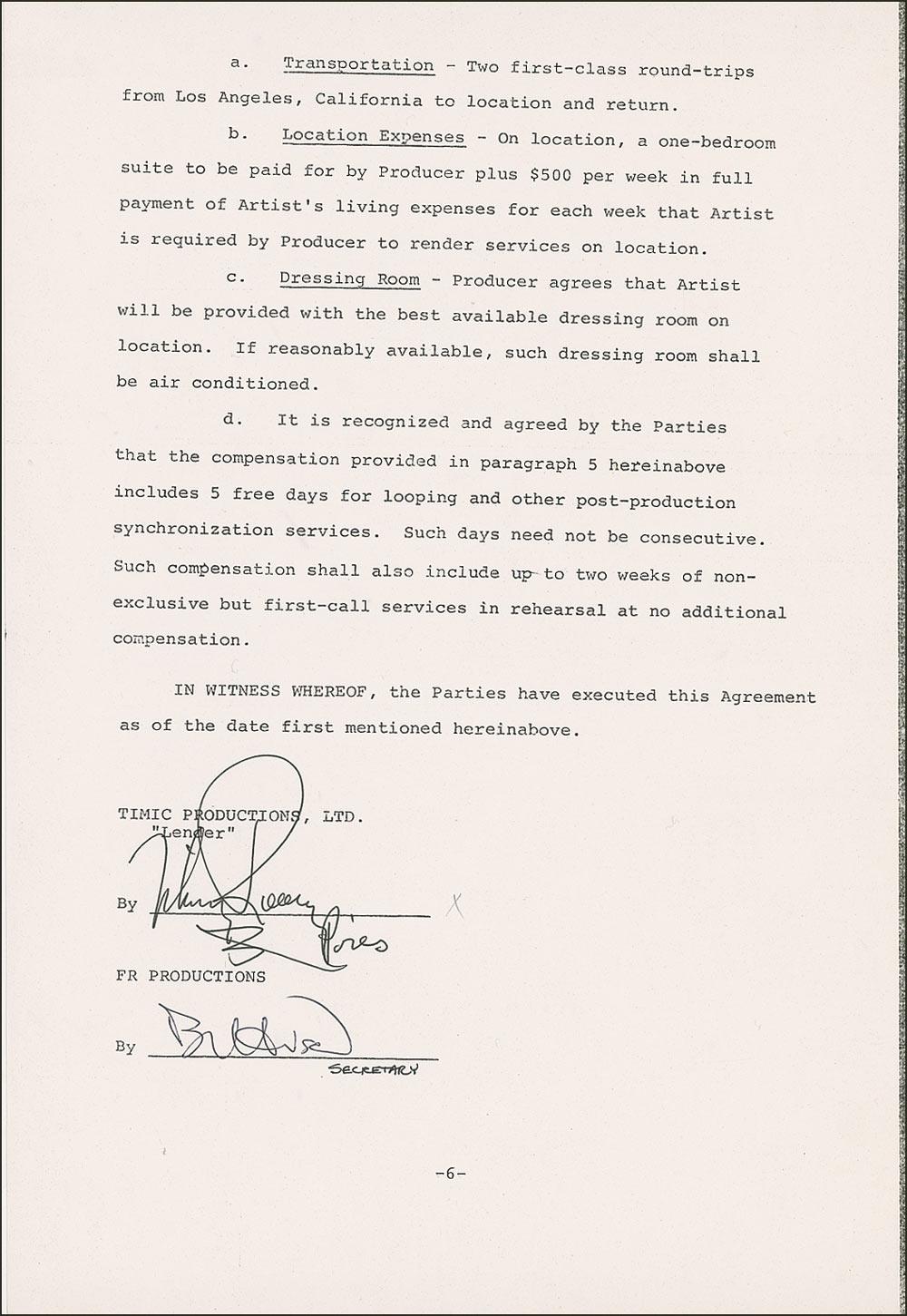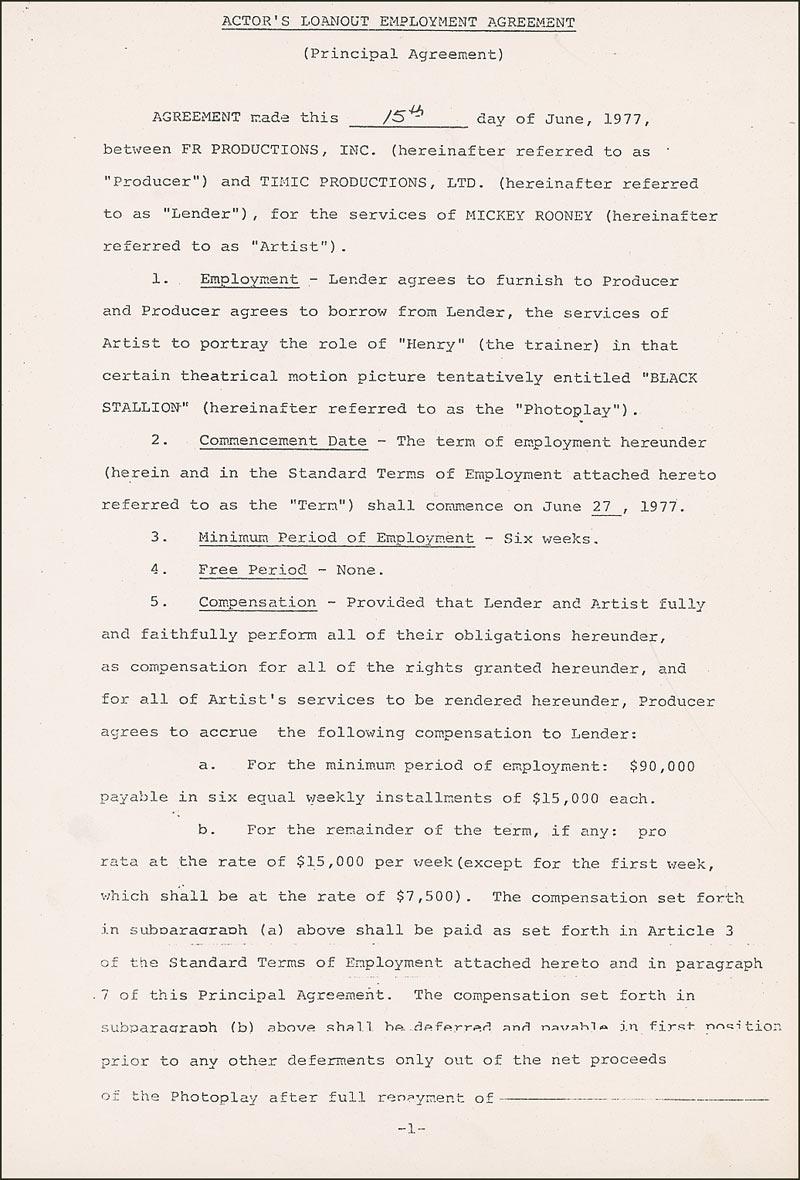 DS, signed “Mickey Rooney,” six photocopied pages, 8.5 x 12.5, June 15, 1977. Actor’s Loanout Employment Agreement for Rooney between FR Productions and Timic Productions for Rooney’s role as ‘Henry’ in the film Black Stallion “for the minimum period of employment: $90,000 payable in six equal weekly installments of $15,000 each.” In fine condition.