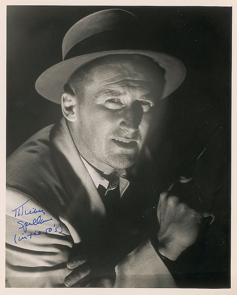 Glossy 8 x 10 photo of Spillane in the 1950s wearing a fedora, signed in blue felt tip, “Mickey Spillane (in the 50’s).” In fine condition.