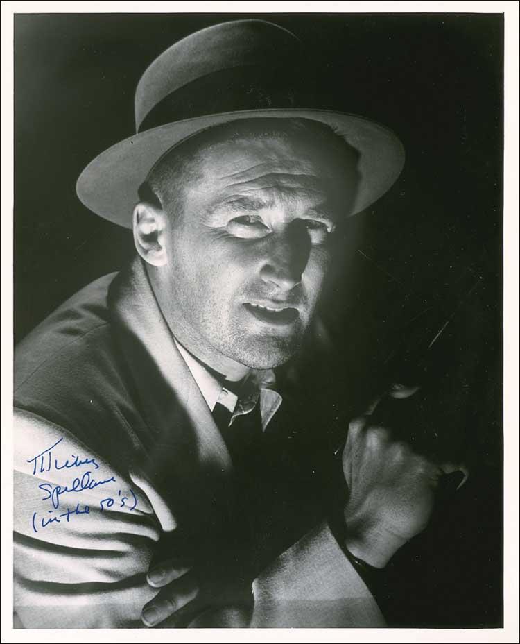 Glossy 8 x 10 photo of Spillane in the 1950s, signed in blue felt tip, “Mickey Spillane (in the 50s).” In fine condition, with a few scattered light creases. RRAuction COA.