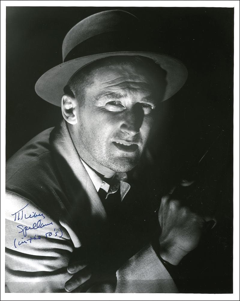 Glossy 8 x 10 photo of Spillane in the 1950s wearing a fedora, signed later on in blue felt tip, “Mickey Spillane (in the 50’s).” In fine condition.