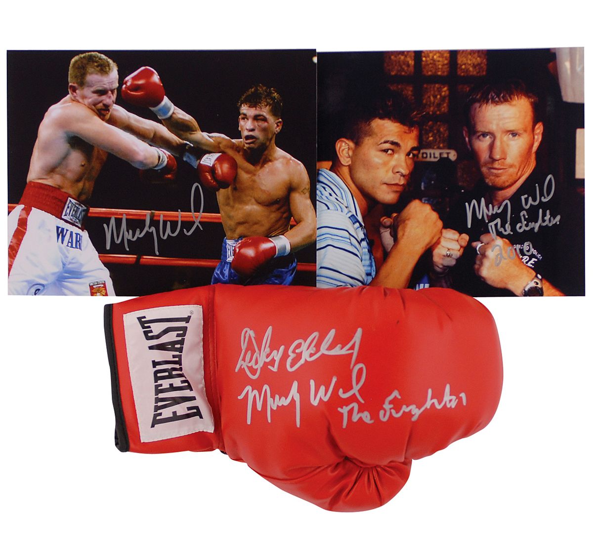 Three items: one red left-handed Everlast boxing glove signed in silver ink on the top, “Mickey Ward, The Fighter,” and “Dicky Eklund;” and two color glossy 10 x 8 photos of Ward, one posed and one in the ring, each signed in silver ink. In overall fine condition. Accompanied by four photos of the signing.
