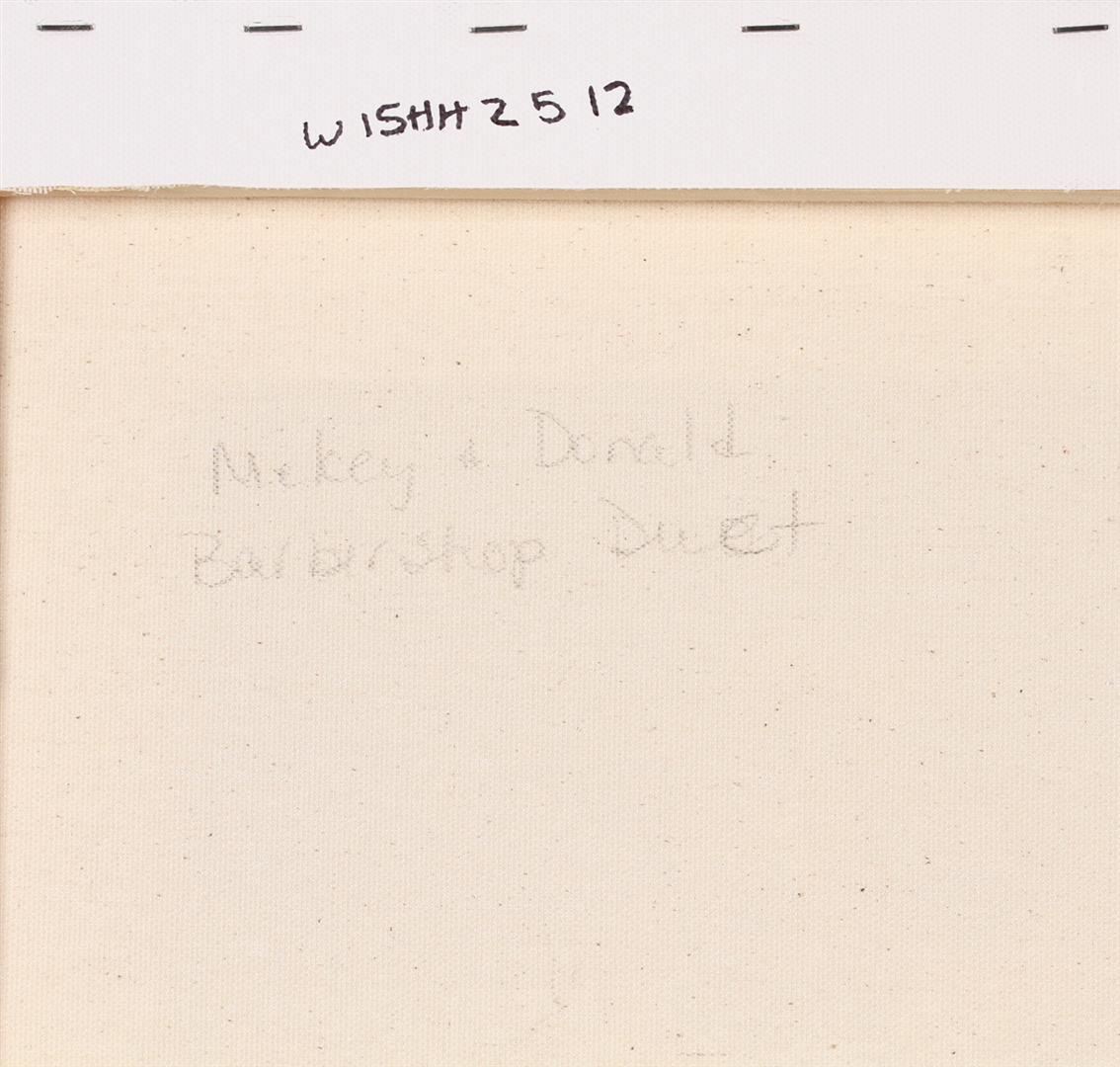 Mickey and Donald Barbershop Duet is a whimsical interpretation of Disney's most popular cartoon characters doing a song and dance to the delight of Ferjo's signature symbols, the pencil, fish, butterfly, strawberry and broken egg. Original oil on canvas size 24x30.