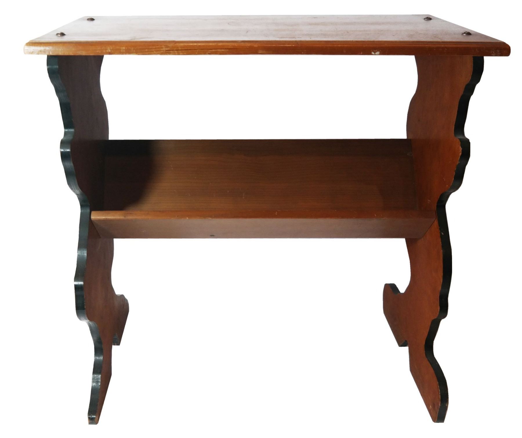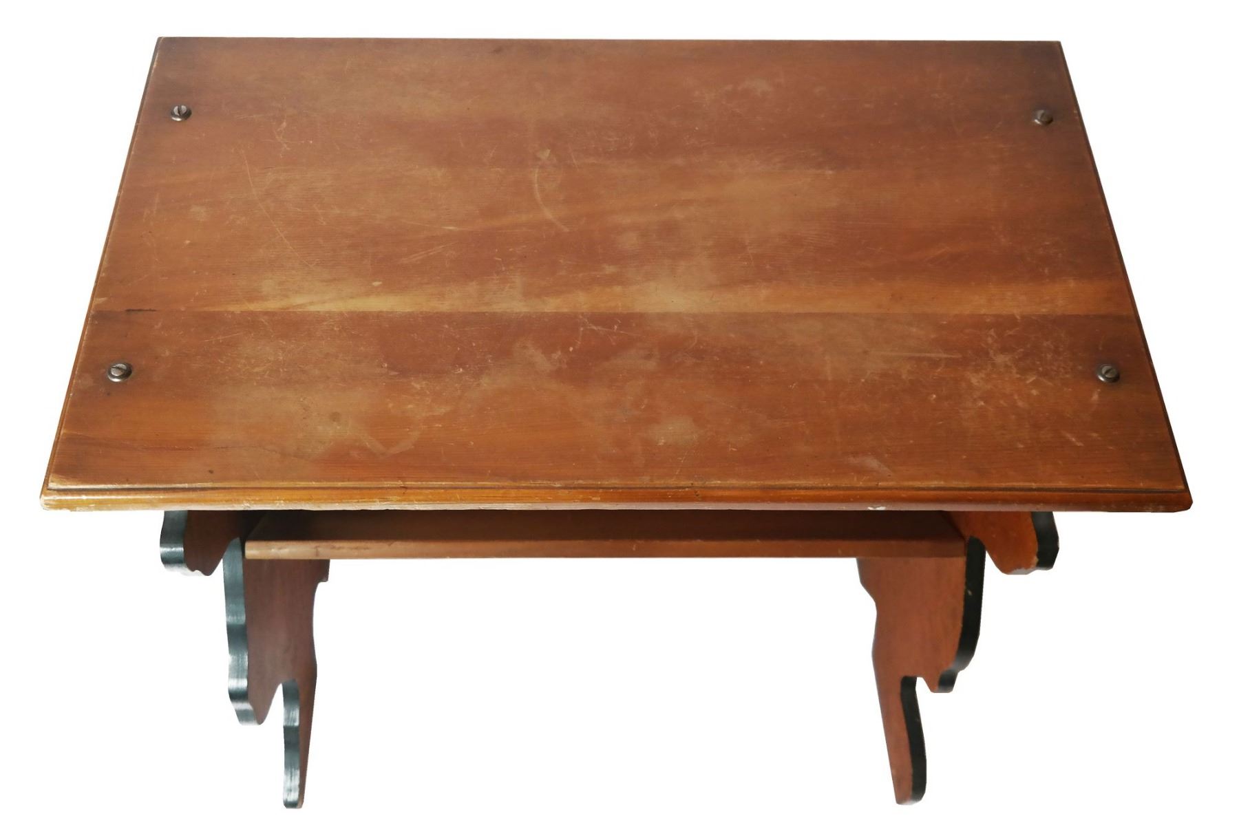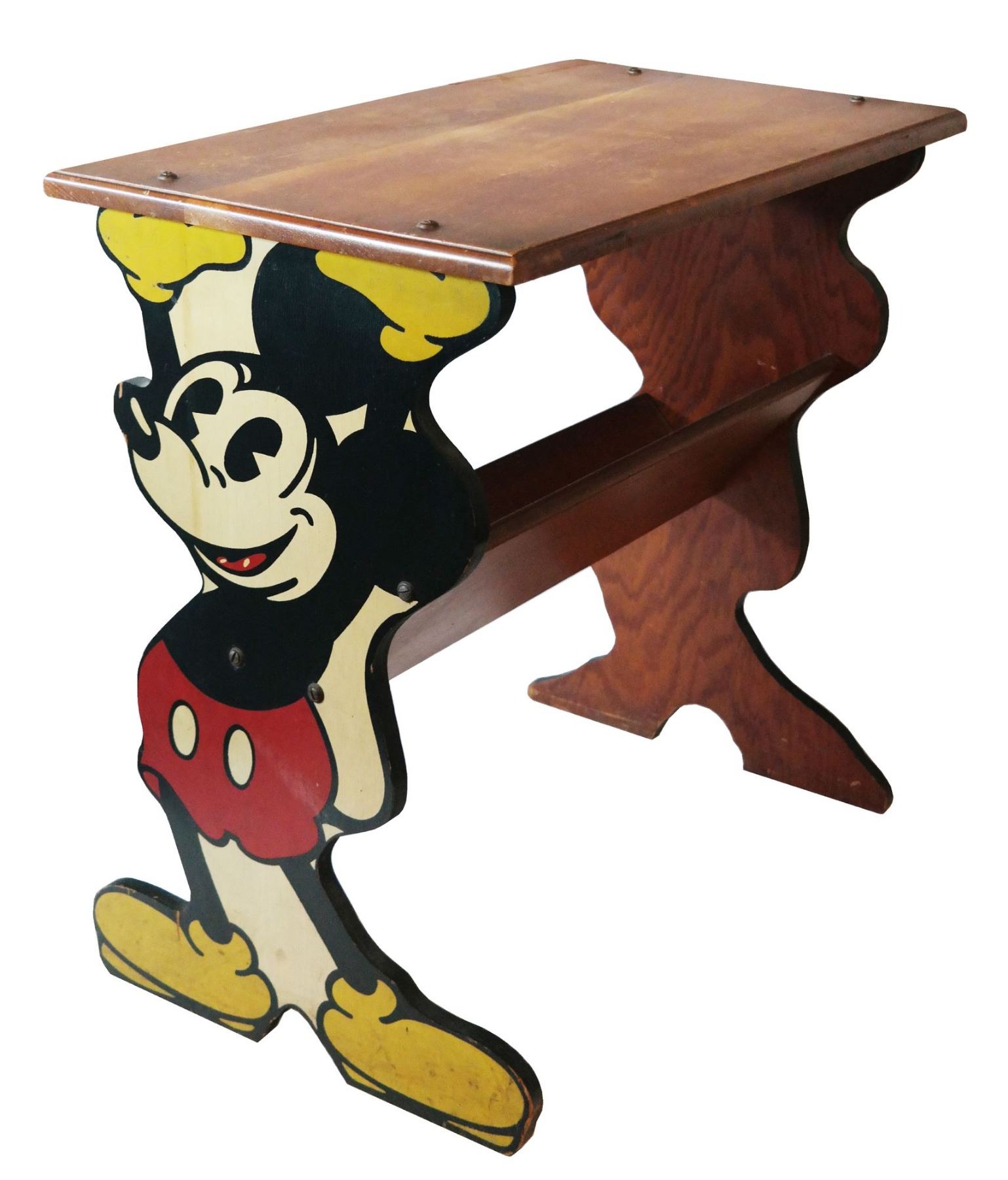 (Kroehler, 1934) A very rare children's desk featuring silkscreened wooden cut-outs of Mickey and Minnie on either end that hold up the table's surface. The table top measures 15.5"x27" and the height of the table is 26". The condition is very good with some wear throughout from use, including a repaired broken corner along the top of the desk.